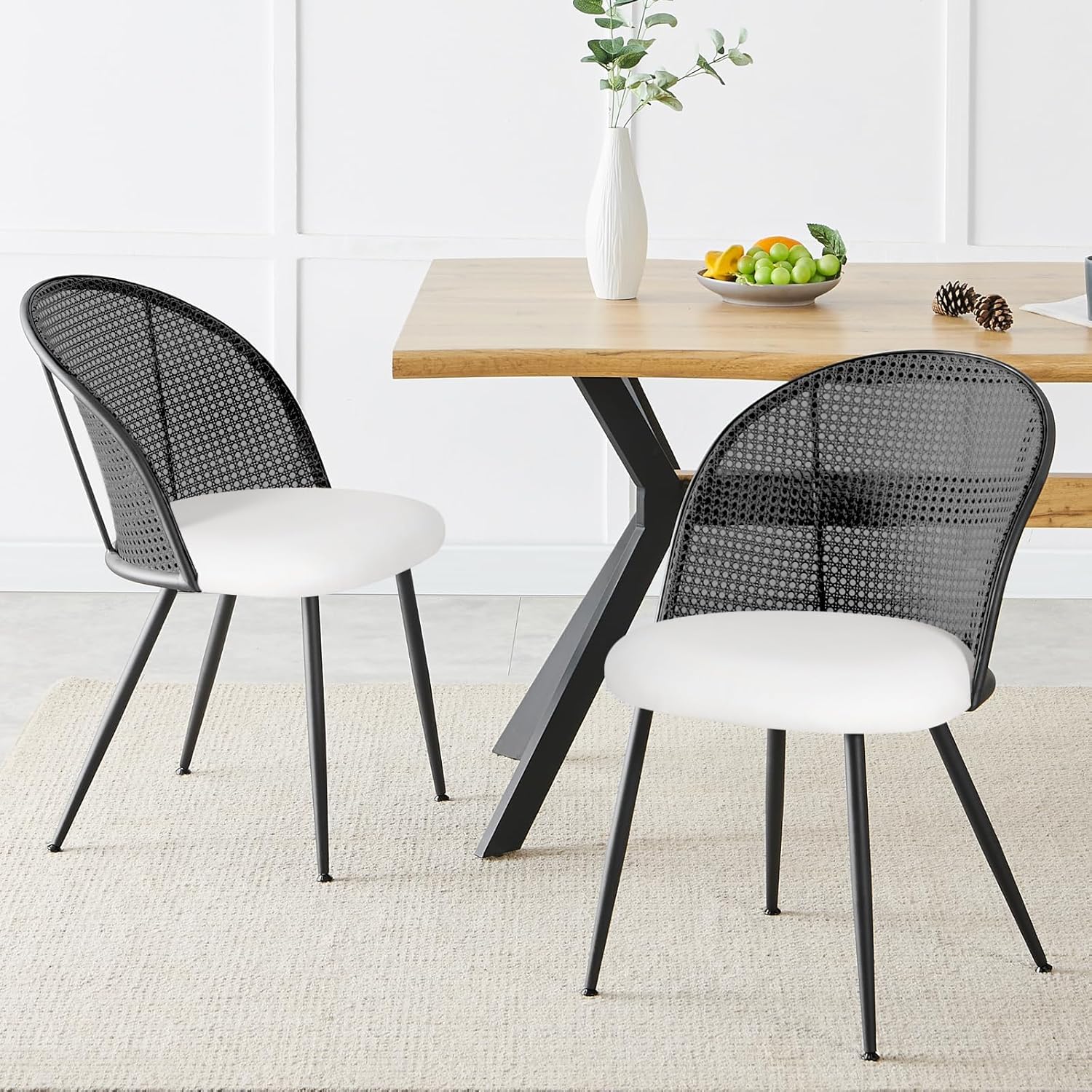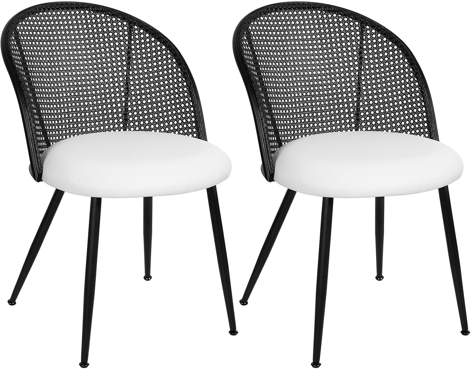 Rattan Dining Chairs Set of 2, Faux Leather Upholstered Dining Chairs with Black Cane Back, Mid-Century Modern Farmhouse Armless Accent Chairs for Kitchen Dining Room, Restaurant,White