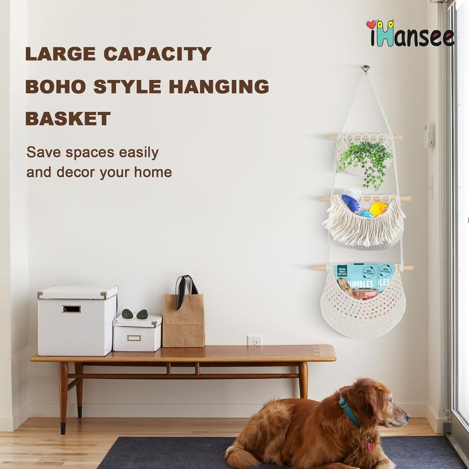 Hanging Baskets for Organizing, 3 Tier Detachable Wall Hanging Fruit Basket Over the Door Organizer for Fruit Vegetable Plant, Beige Boho Cotton Crocheted Fruit Holder for Kitchen Bathroom Bedroom