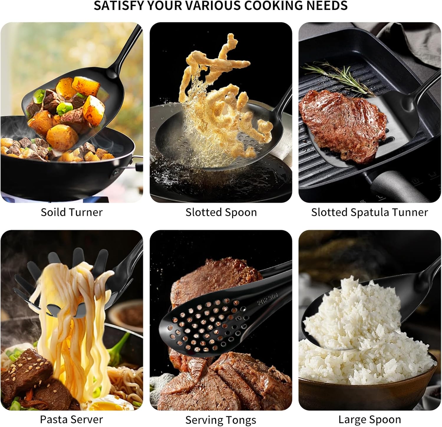 - 12Pcs Kitchen Utensils Set: Lazycorner Utensils Serving Set consists of 1 Soild Turner, 1 Soup Ladle, 1 Slotted Spoon, 1 Slotted Spatula Tunner, 1 Pasta Server, 1 Large Spoon, 1 spaghetti spoon, 1 Serving Spoon, 1 Slotted Spoon, 1 Meat Fork, 2 Serving Tongs. Enhance your cooking experience with 11 kitchen accessories that perfectly for your cooking needs