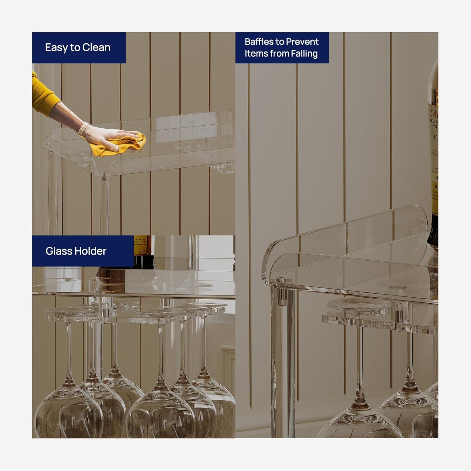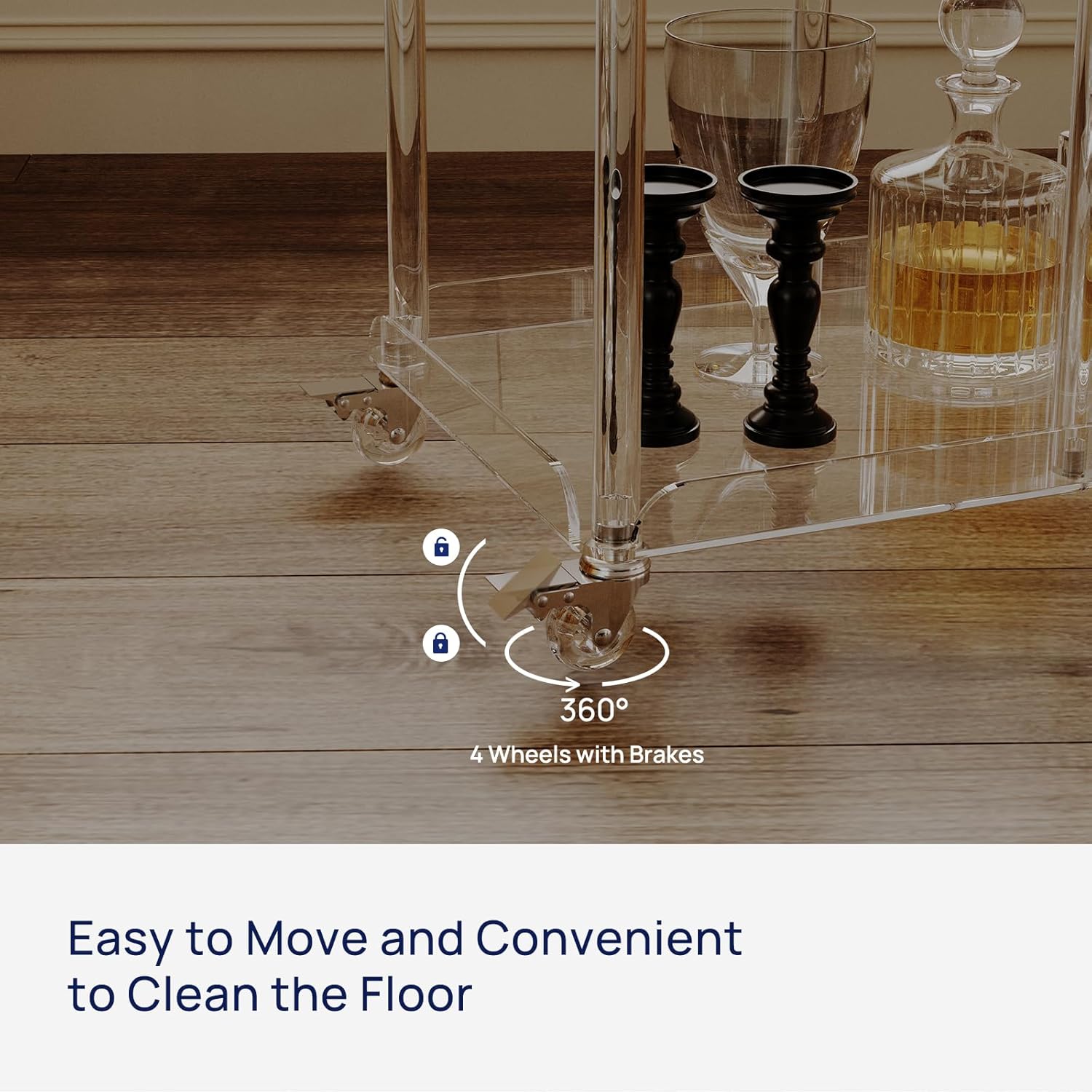 HMYHUM Acrylic Bar Cart with 4 Lockable Wheels, 3 Tier Clear Serving Cart with Glass Holder, Rolling Beverage Cart for Home, Kitchen, Dinning Room, 23.6''D x 15''W x 32.3''H
