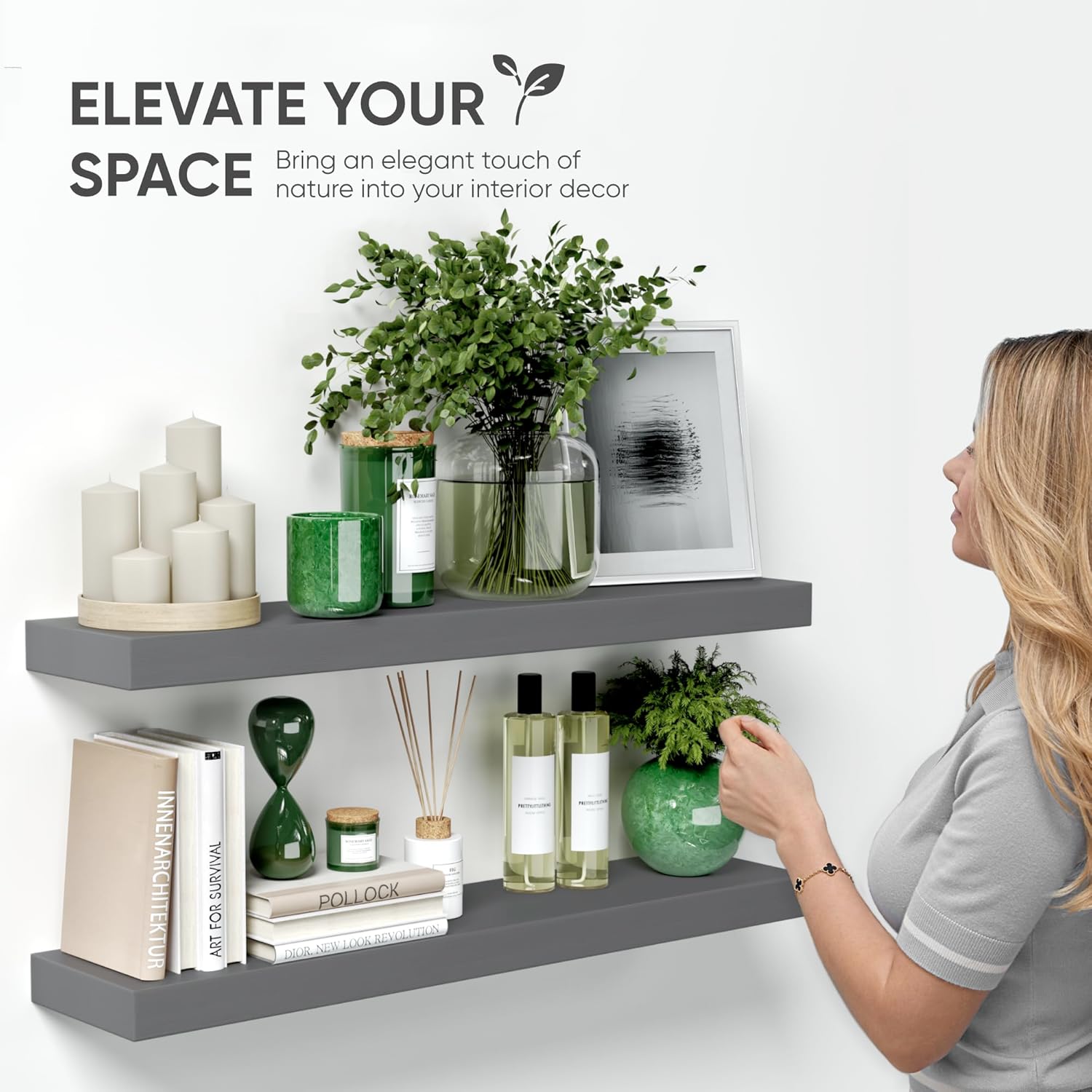 Homeforia Gray Floating Shelves for Wall, Premium Solid Wood Grey Shelf, Grey Bathroom Shelves, Heavy Duty Bracket, 30 x 6.5 x 1.75 inch, Set of 2
