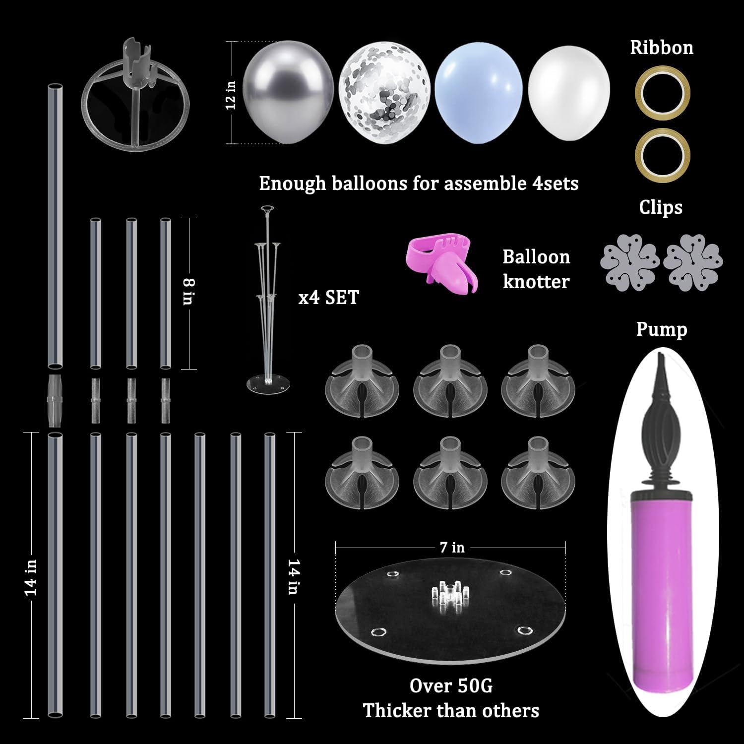 - WHAT INLCUDE: This balloon stand kit include 4 set balloon holders, 35pcs balloons - light blue and white balloons, silver and silver confetti balloons, balloon pump, balloon clips, ribbons, glue dots and tie tool