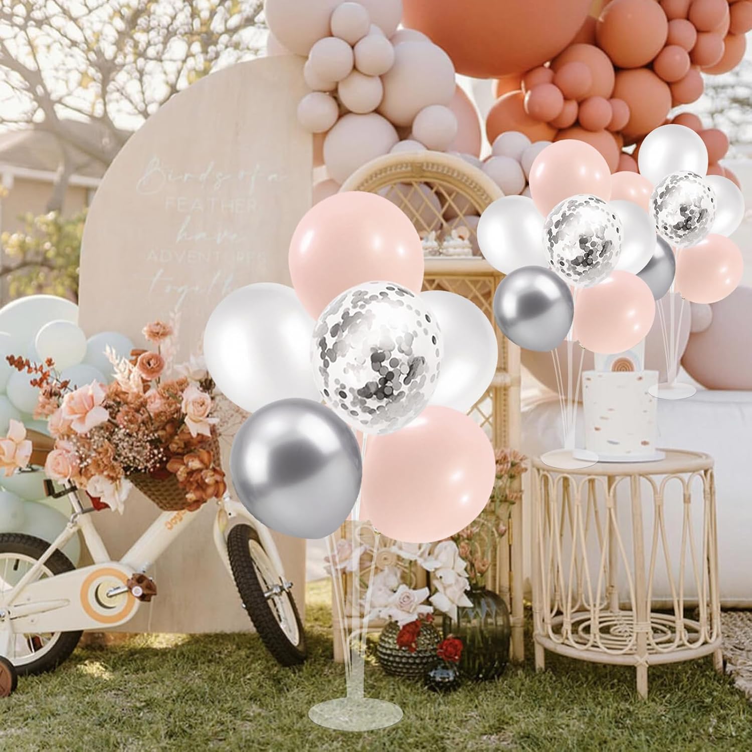 - WHAT INLCUDE: This balloon stand kit include 4 set balloon holders, 35pcs balloons - pink and white balloons, silver and silver confetti balloons, balloon pump, balloon clips, ribbons, glue dots and tie tool