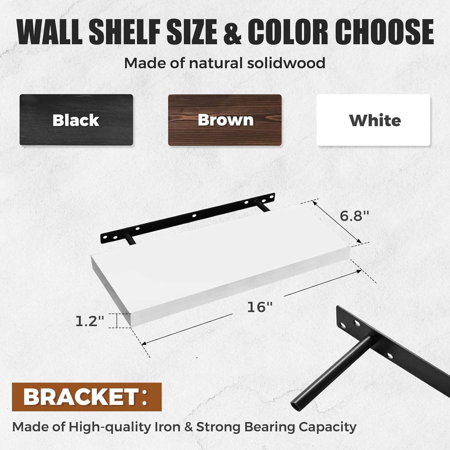 Floating Wall Shelves - 16"x6.8"x1.2" Sturdy Rustic White Solid Wood Shelves for Storage and Décor, Easy Installation for Living Room, Bedroom, and Kitchen - 2 Pack