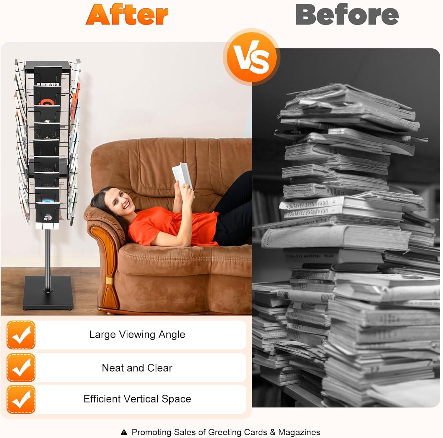 - πΆππππππππ π¨ππππππππ: This magazine racks is a compact and comprehensive display stand that maximizes the use of limited space. The fully utilized four sides have a total of 36 pockets, which can meet your need to display a large amount of magazine materials at once and allow you to easily arrange cards according to color, event, or type, making it easier for customers to browse and find what they want