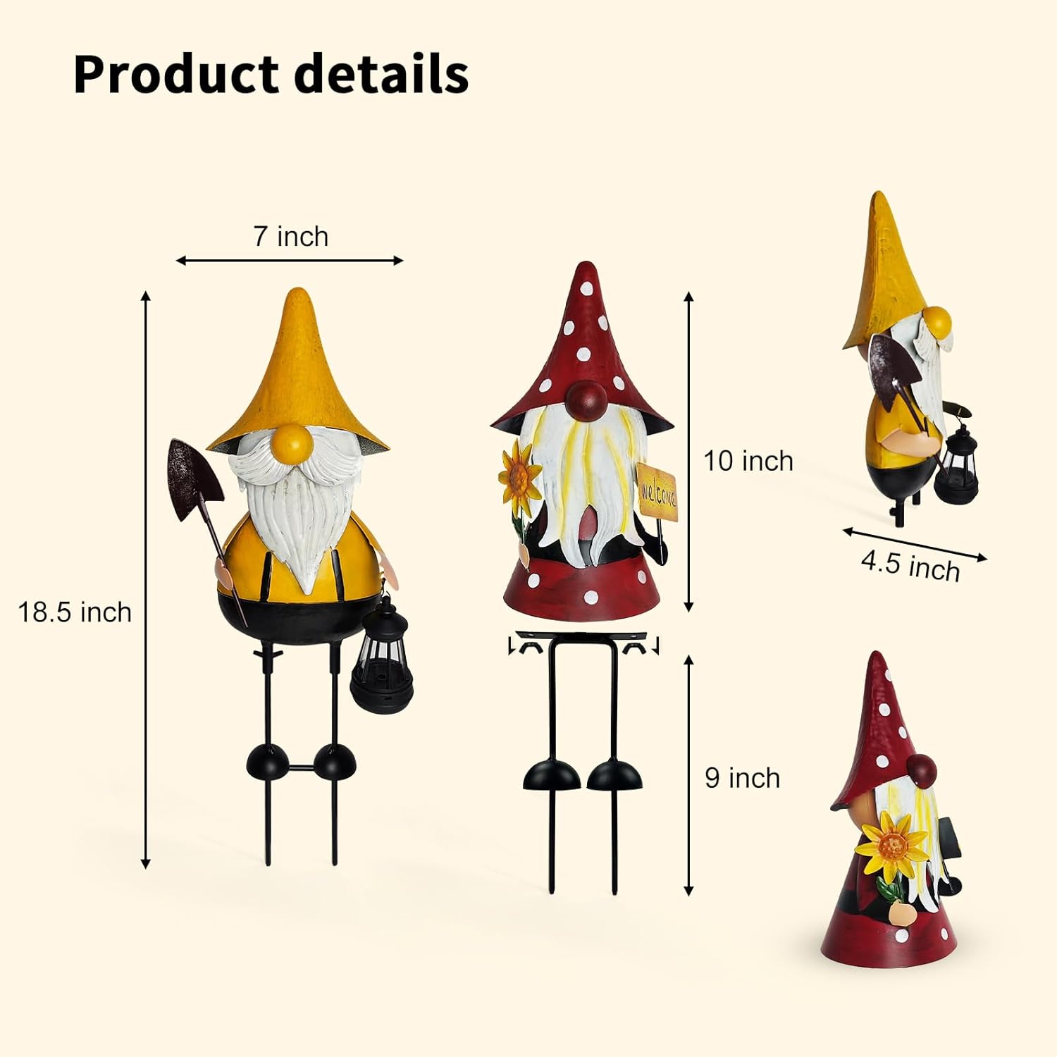 - 【Practical Gnome Decorations】The metal gnome garden stake is 18 inch tall. handcrafted gnome body structure, easy to assemble, 2 screw bases at the bottom of the gnomes, which can be firmly connected with stakes as garden decorative stakes, making your yard and garden more lively & interesting