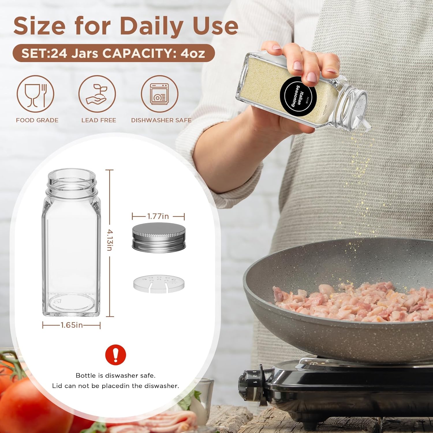 - 【Complete Spice Rack with Spice Jars Set】: This set of spice jars contains: 4 pack magnetic spice rack, 24 x 4oz glass spice jars with 4 sheets pre-printed labels and 1sheet blank label, 1 white pen , 1 silicone folding funnel (for refilling). All necessary accessories, in one box, no need to purchase separately. This set of seasoning containers with labels is the best choice for your kitchen.