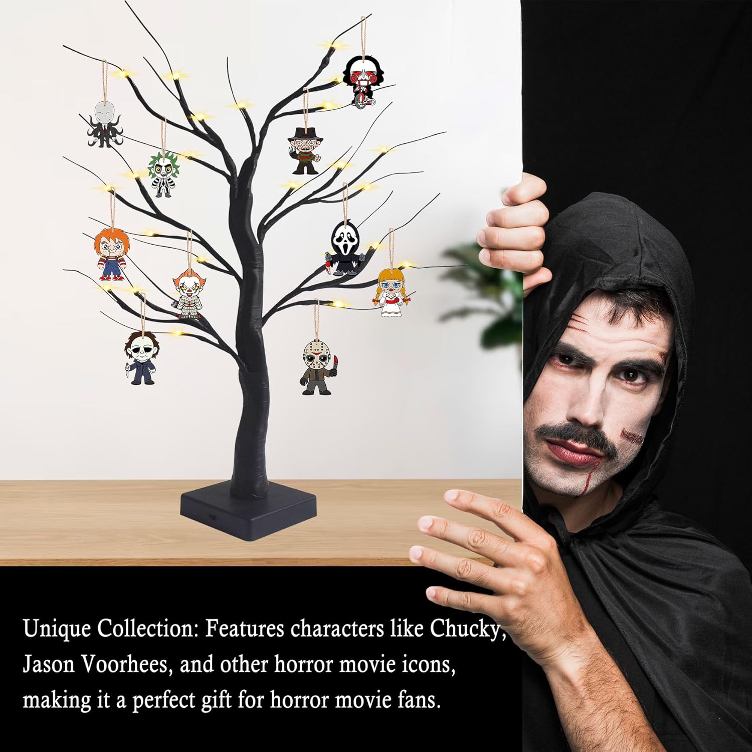 Black Halloween Tree with LED Lights and Spooky Wooden Hanging Ornaments Horror Movie Ornaments, Light Up Halloween Decor
