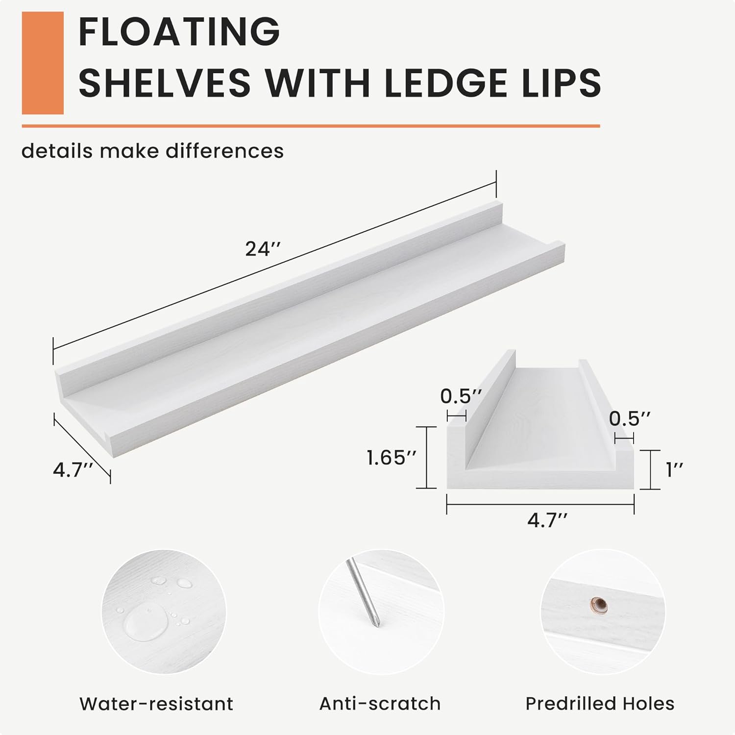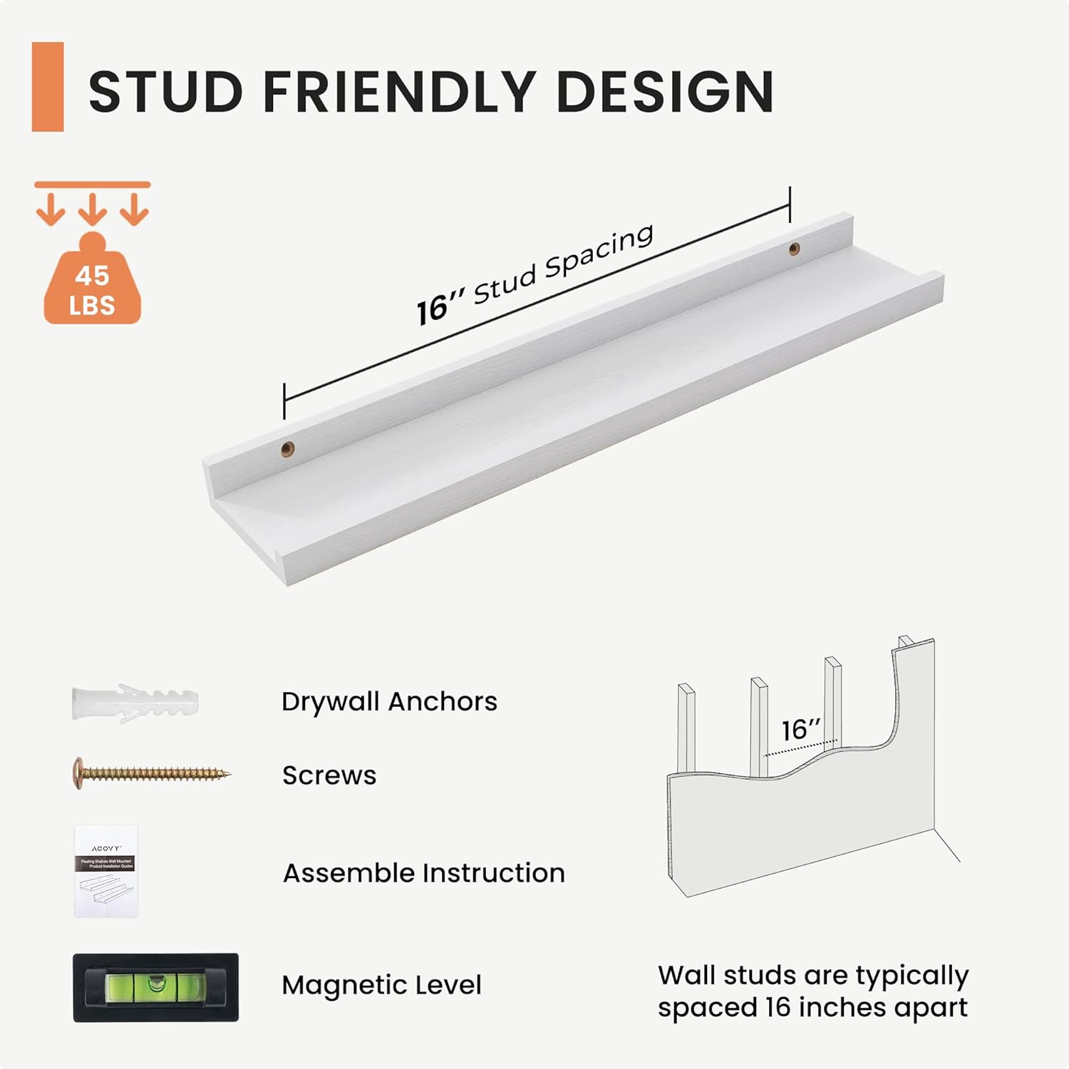 - Secure and Reliable: The mounting holes are expertly spaced at 16 inches to align perfectly with wall studs, ensuring a secure installation. Each wall shelf supports up to 45 lbs, This thoughtful design guarantees that your floating shelf with lip are anchored safely, offering stability and peace of mind for displaying any of your favorite items