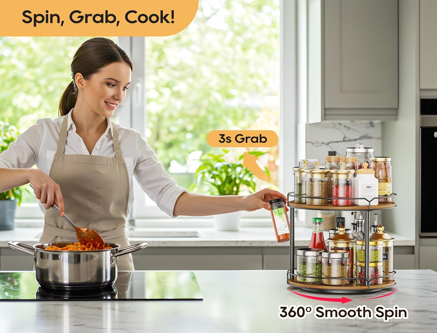- 2. Efficient Design for Easy Access: Whether you're grabbing your favorite spices or toiletries, our Lazy Susan organizer makes it easy. The two-tier design allows for efficient storage, while the rotating design ensures easy access to all your items