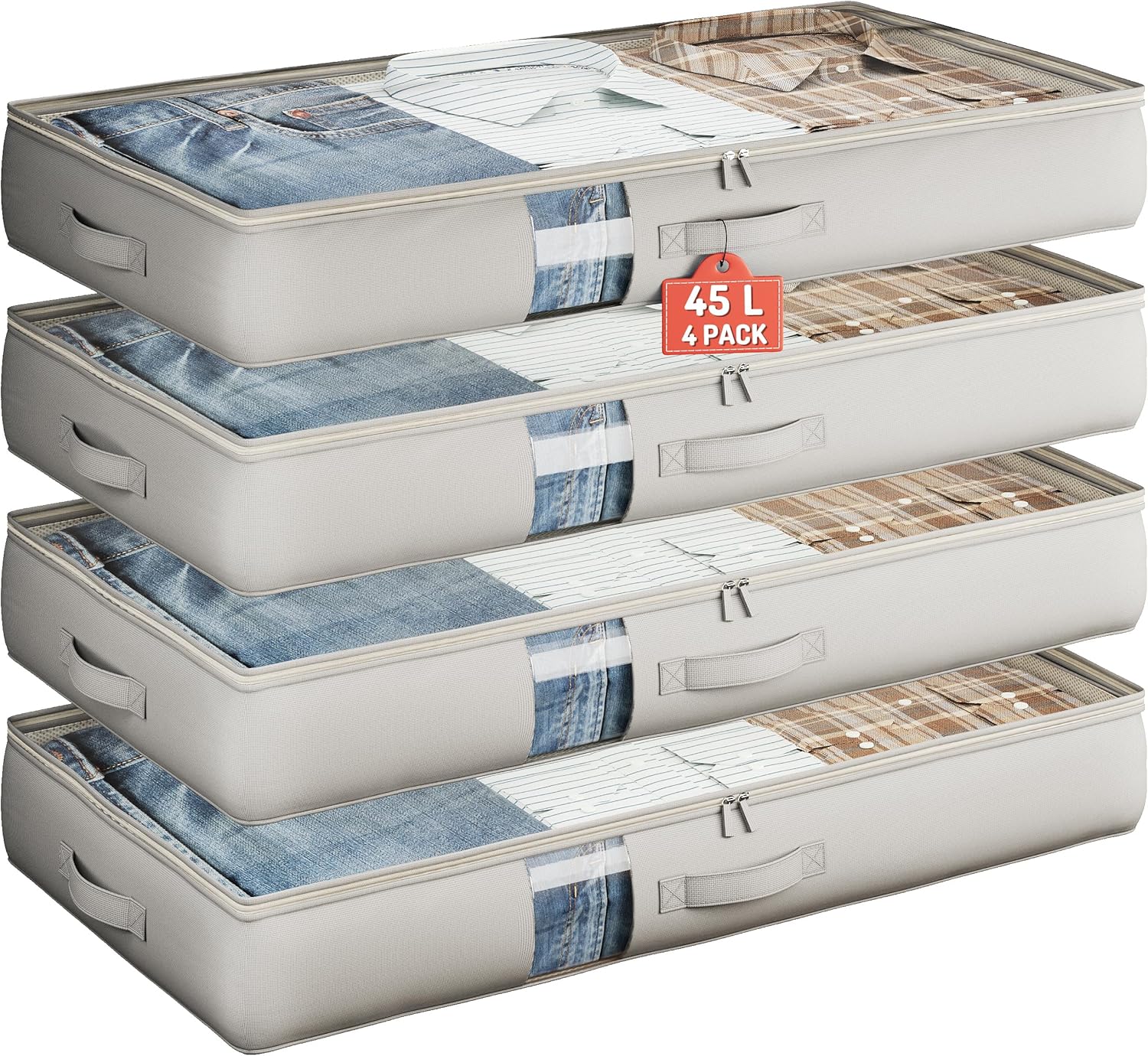 Under Bed Storage Containers with Window, Closet Organizers and Storage Bags, Foldable Underbed Storage Bags for Blankets, Clothing, Comforter, Linen Sheets, Wrapping Paper, 4 Pack, Grey
