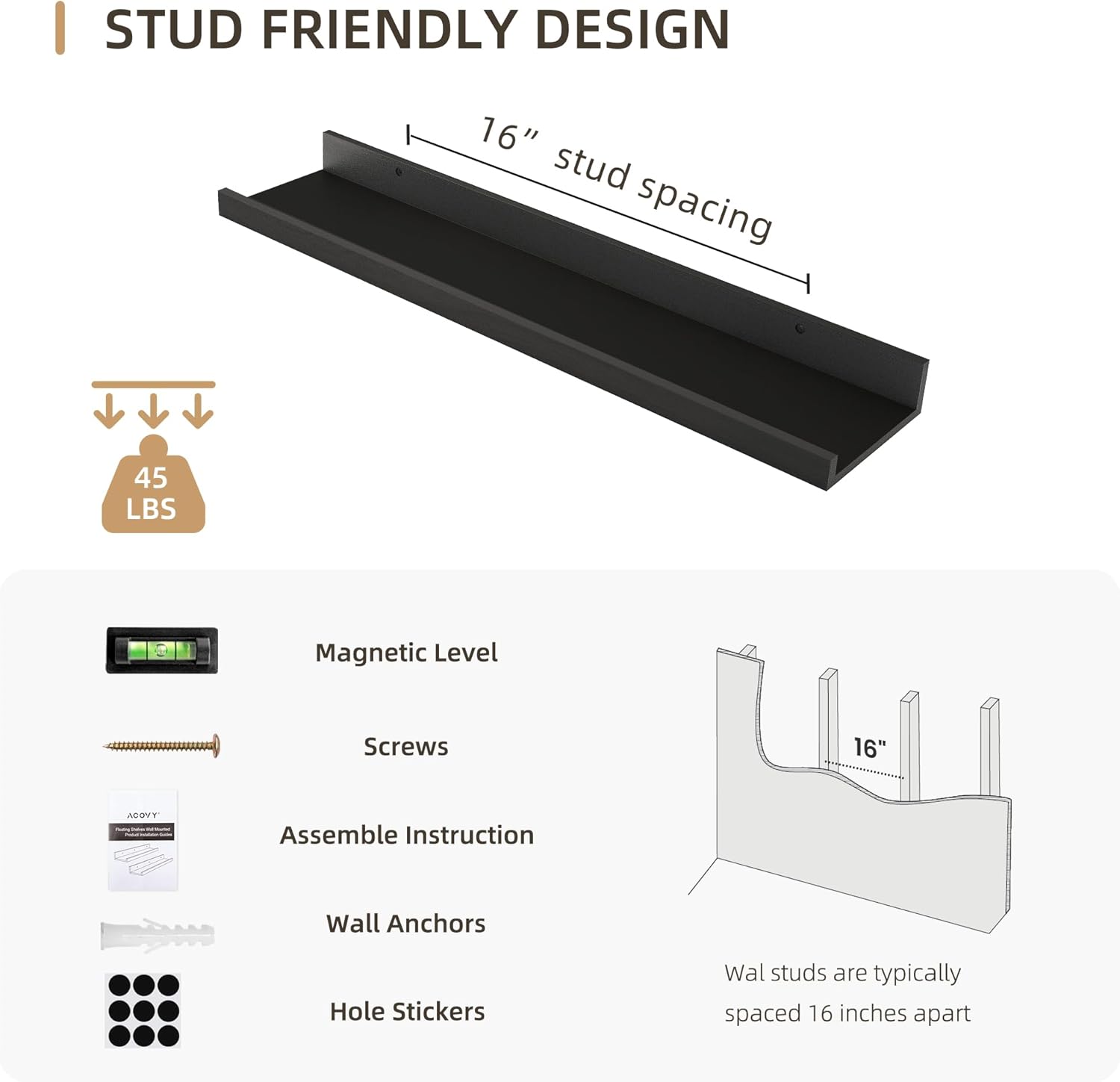 - 【Superior Quality】 Crafted from high-quality wood, each floating shelf is designed for long-lasting durability. The pre-drilled mounting holes are spaced 16 inches apart, ensuring a secure installation into wall studs.