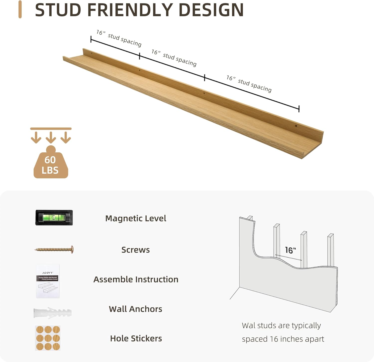 - 【Superior Quality】 Crafted from high-quality wood, each floating shelf is designed for long-lasting durability. The pre-drilled mounting holes are spaced 16 inches apart, ensuring a secure installation into wall studs.