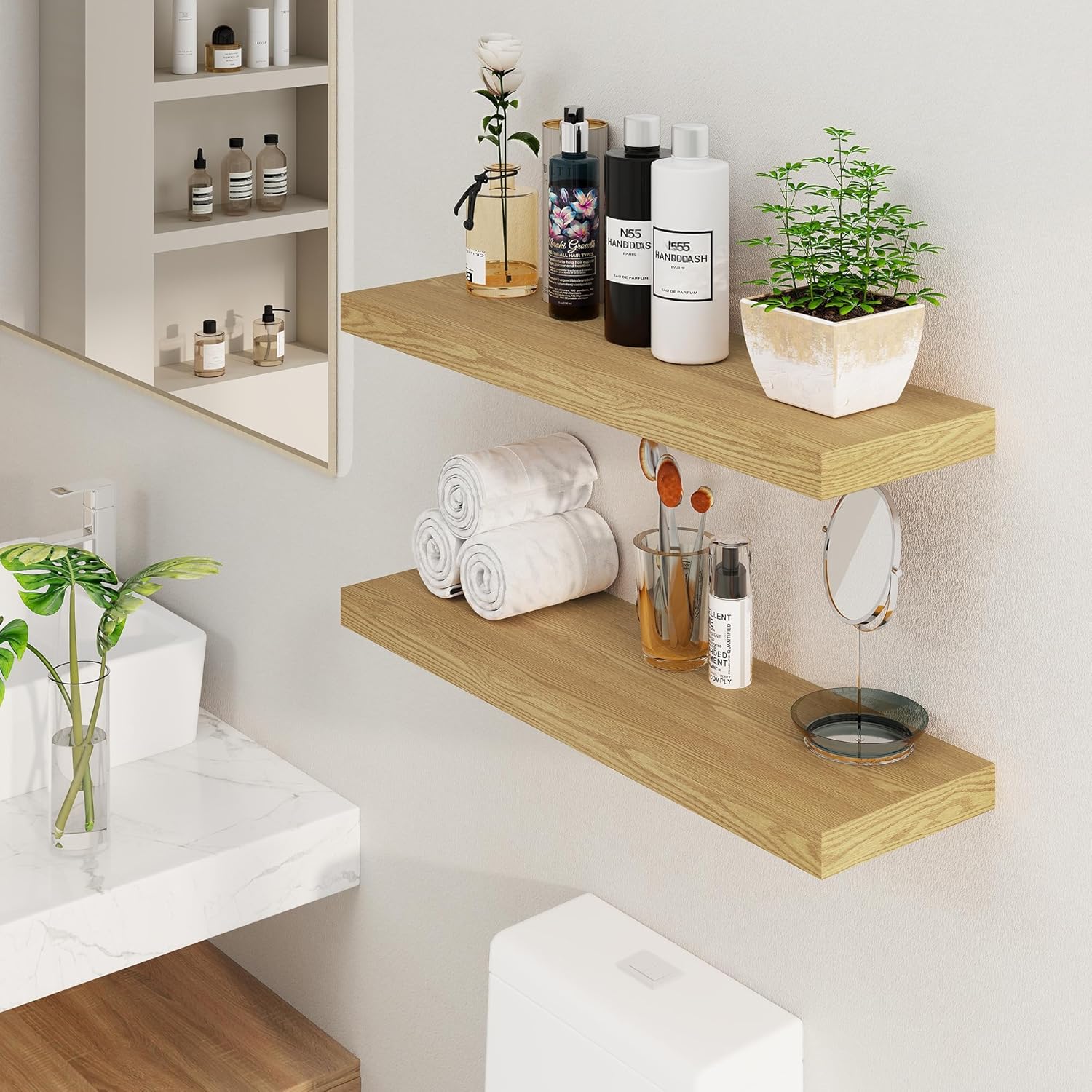 - 【DECORATIVE & FUNCTIONAL】The wall-mounted floating shelves are designed for decoration and storage, utilizing and decorating any space in your home. Used as shelf decor to show your collection, books, or prize, the hanging shelves are perfect for displaying your photo frame, small plants, model, or audio in your living room, office, study. And can also use as over the toilet storage shelf in the bathroom to hold toiletries or used as kitchen shelf to storage condiments.