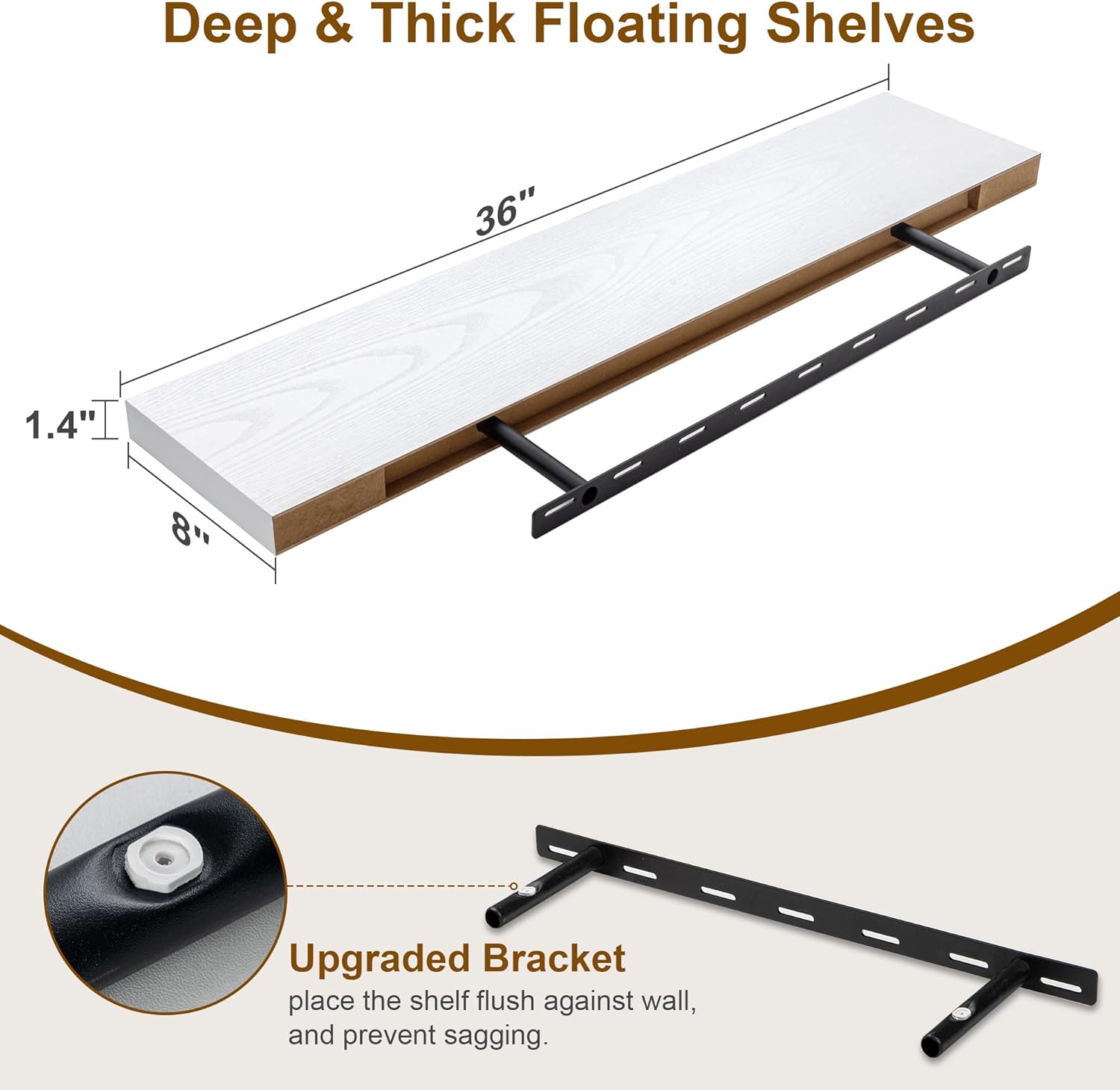 - 【8 INCH DEEP FLOATING SHELF】This extra deeper and thicker wall shelves are 8 inches in depth and 1.4 inches in thickness instead of the regular narrow floating shelves, you can put photos, pictures, DVD players, videos, books, toys, and some other knickknack on this beautiful display wooden shelf.