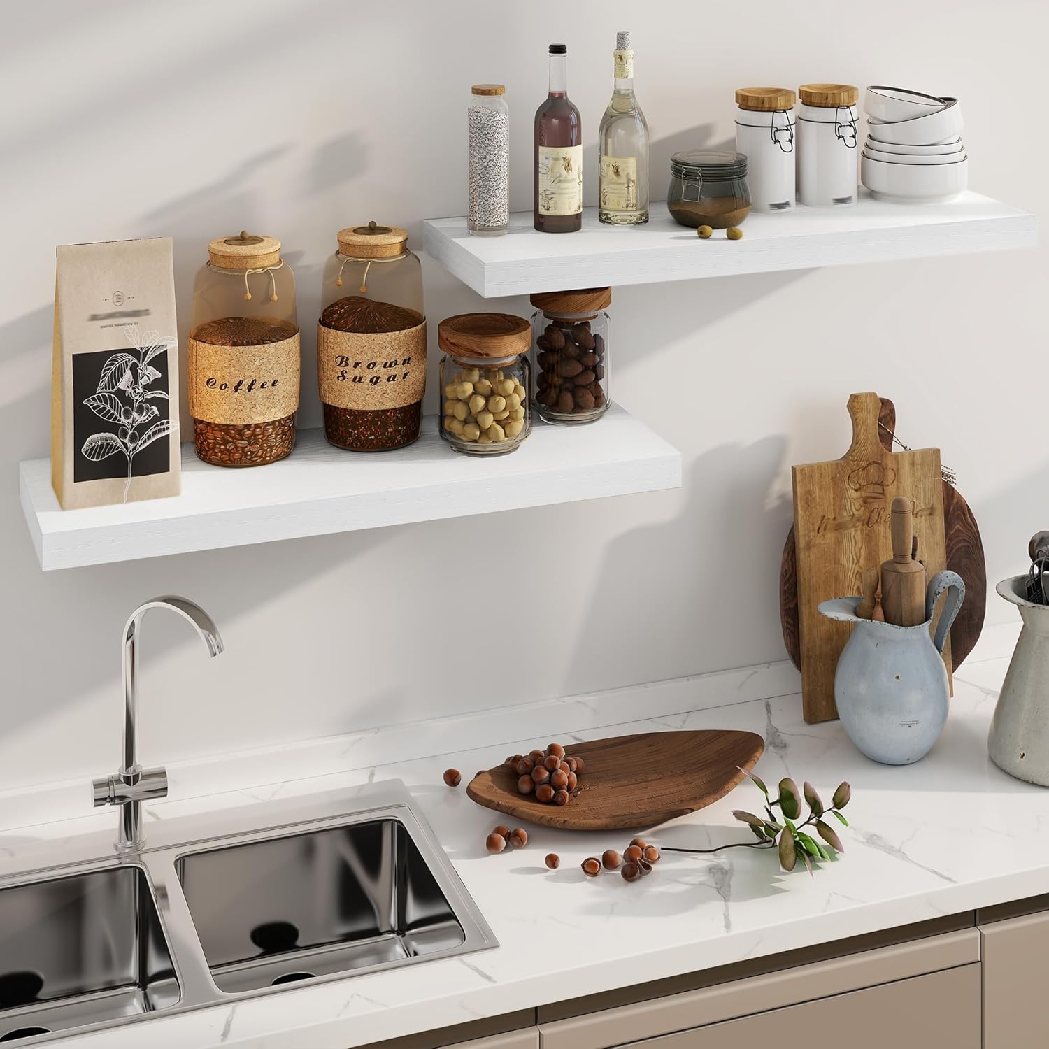 - 【DECORATIVE & FUNCTIONAL】The wall-mounted floating shelves are designed for decoration and storage, utilizing and decorating any space in your home. Used as shelf decor to show your collection, books, or prize, the hanging shelves are perfect for displaying your photo frame, small plants, model, or audio in your living room, office, study. And can also use as over the toilet storage shelf in the bathroom to hold toiletries or used as kitchen shelf to storage condiments.