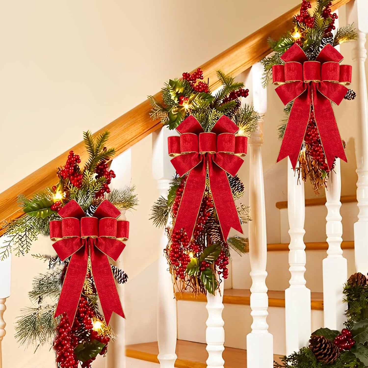 - Wide application: The velvet fabric makes large red bows particularly striking, especially when paired with traditional Christmas colors like red, green, or gold - They can be decorated on tree topper, wreaths, windows,doors, fences, fireplaces, garlands,stairs, or as standalone accents around your home, these bows are as versatile as they are beautiful