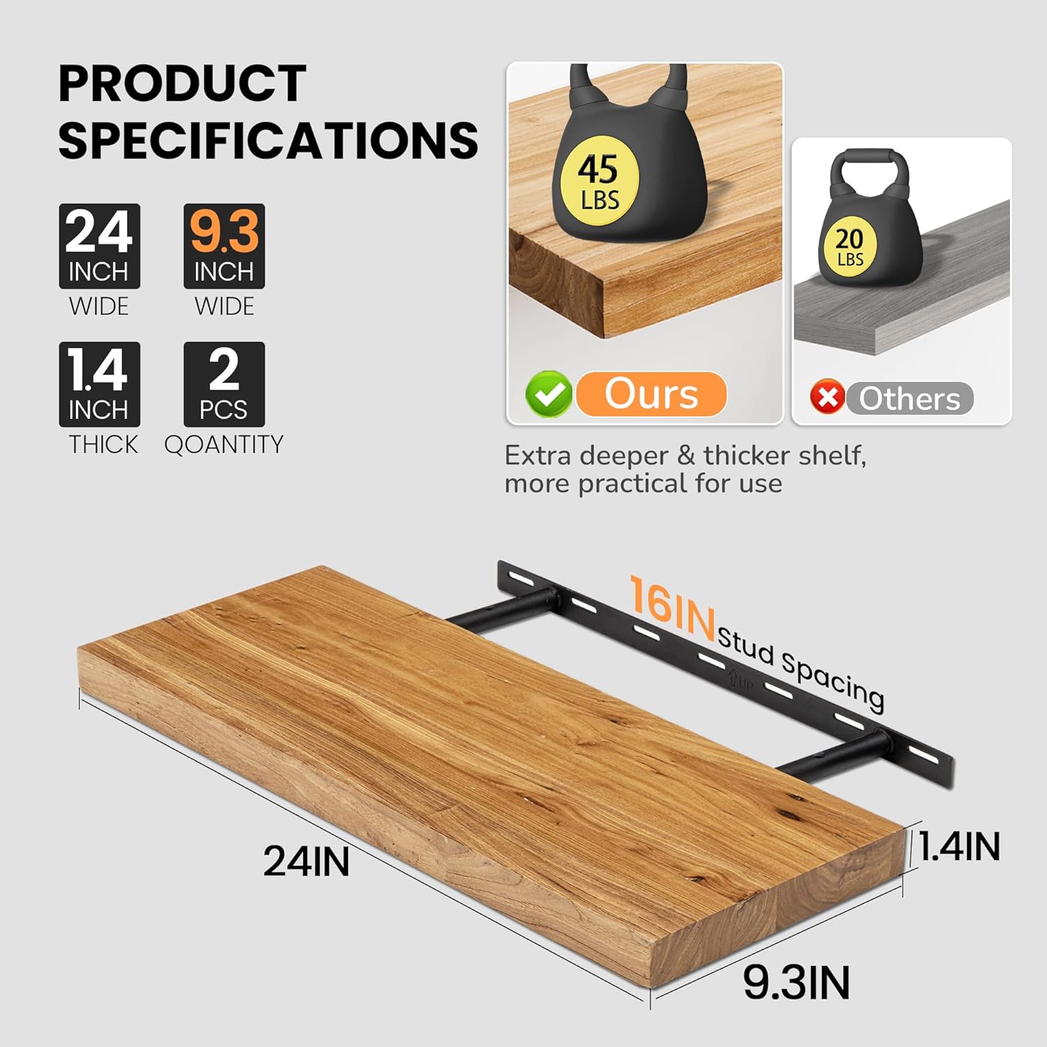 Fun Memories Floating Shelves for Wall, 24"x9.3" Rustic Solid Elm Wood Shelves, Heavy-Duty Wall Mounted Shelves with Invisible Brackets, Set of 2 for Living Room, Bedroom, Kitchen, Natural Finish