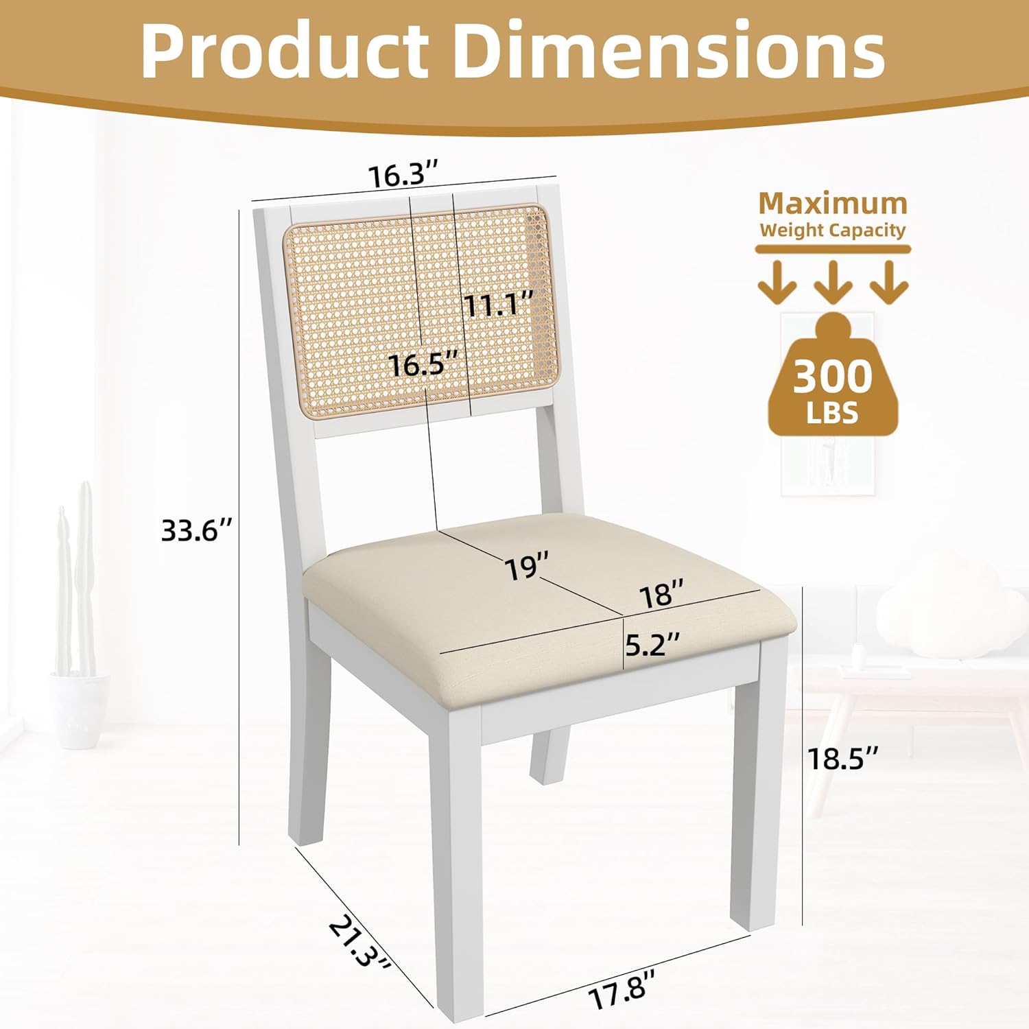 - 【Sturdy Wooden Frame】Made from solid rubber wood, our rattan dining room chair can support up to 300 pounds. Its four thick wooden legs ensure a stable foundation for sitting, while the integrated design of the backrest and back legs enhances the chair’s durability