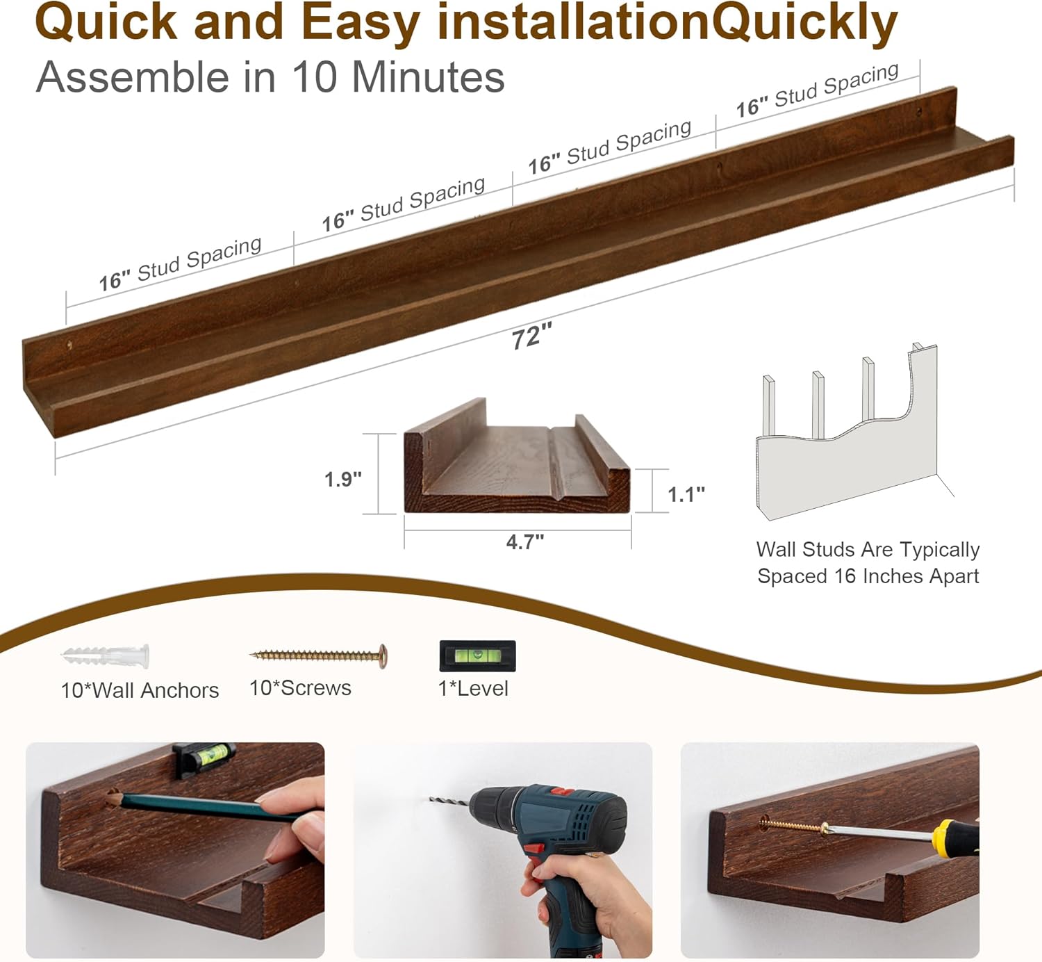 Floating Picture Ledge Shelves 72 Inch Solid Oak Wood Set of 2, Rustic Wall Storage Shelves with Lip, Kids Bookshelf, Photo & Picture Ledge Shelves for Bedroom, Living Room, Kitchen