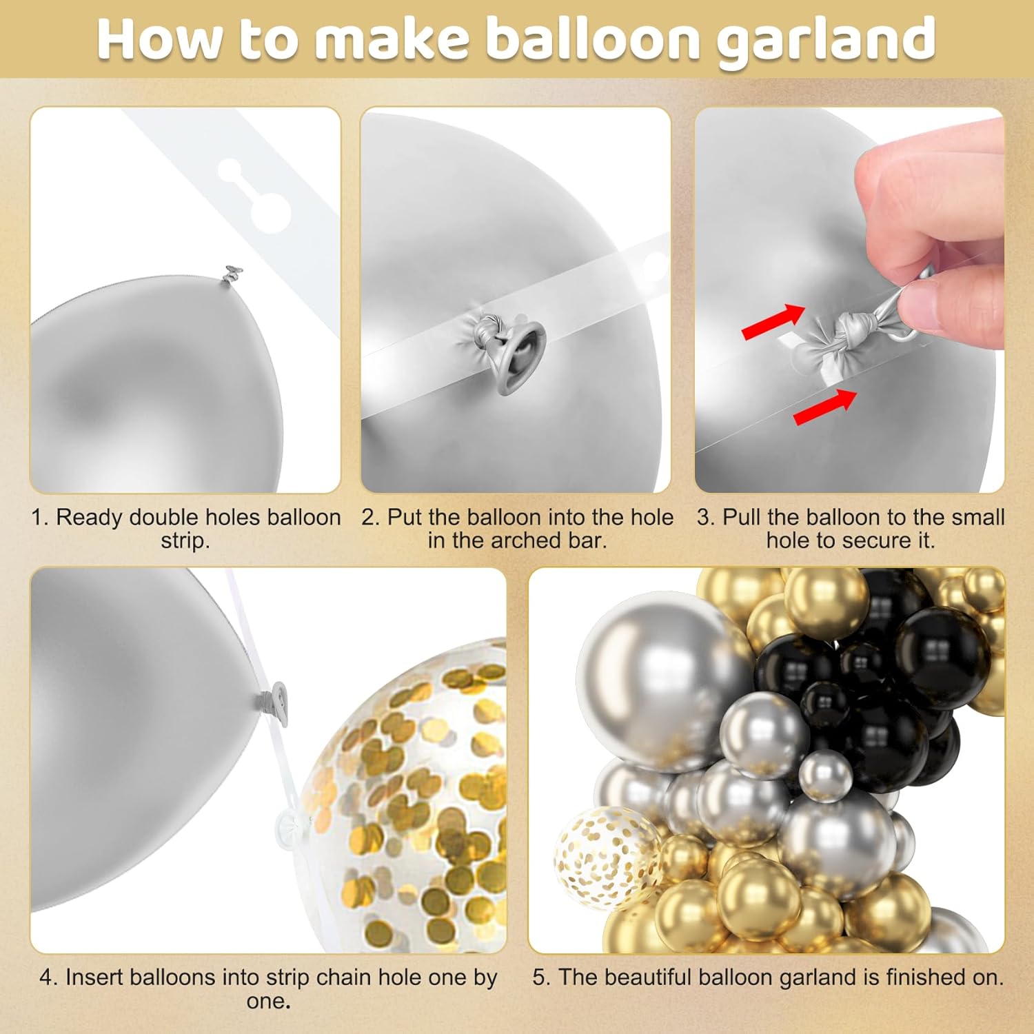 - Easy to Use: Our black and gold balloon arch kit come with balloon tools which can help you create easier and faster; You can make daisy balloons with flower clips; Hooks can help secure balloons better where you need; Design your black and gold birthday decorations by inflating balloons with helium or air, and then attach with the arch strip or ribbon; Besides, use glue points to add small black and gold balloons to the garland; Mix balloons of different sizes and colors for endless style