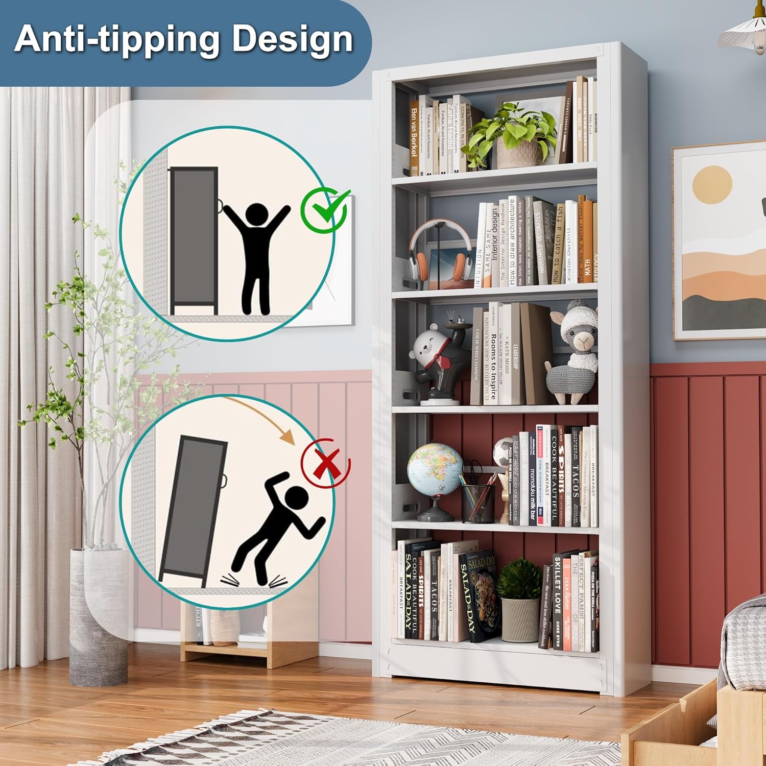 5-Tier Metal Bookshelf, 69" Tall Bookcase, Adjustable Bookshelves with Deep Display Shelves, Heavy Duty Book Shelf, Open Book Cases for Living Room, Home, Office, Library, Garage (White)