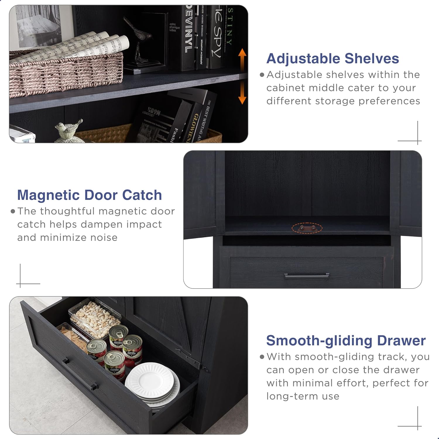 Farmhouse Kitchen Pantry Cabinet - 72" Tall Large Wood Kitchen Storage Cabinets with Adjustable Shelves & 2 Barn Doors & Drawer, Versatile Storage for Dining Room, Bathroom, Living Room, Antique Black