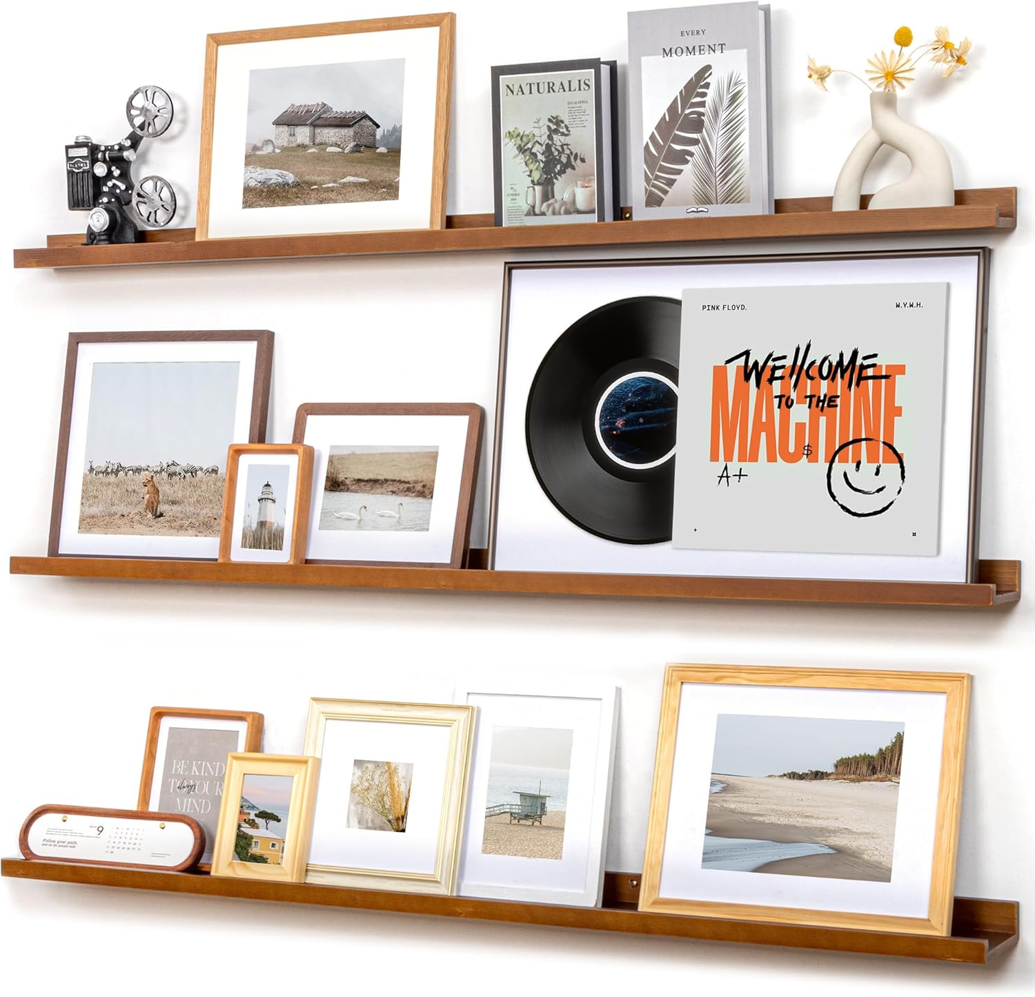 Picture Ledge Wall Shelves 56 inches Width Set of 3, Solid Pine Wood Rustic Floating Ledge Shelves for Wall for Kids' Room Bedroom Kitchen Bathroom Long Floating Shelves for Wall Decor, Walnut