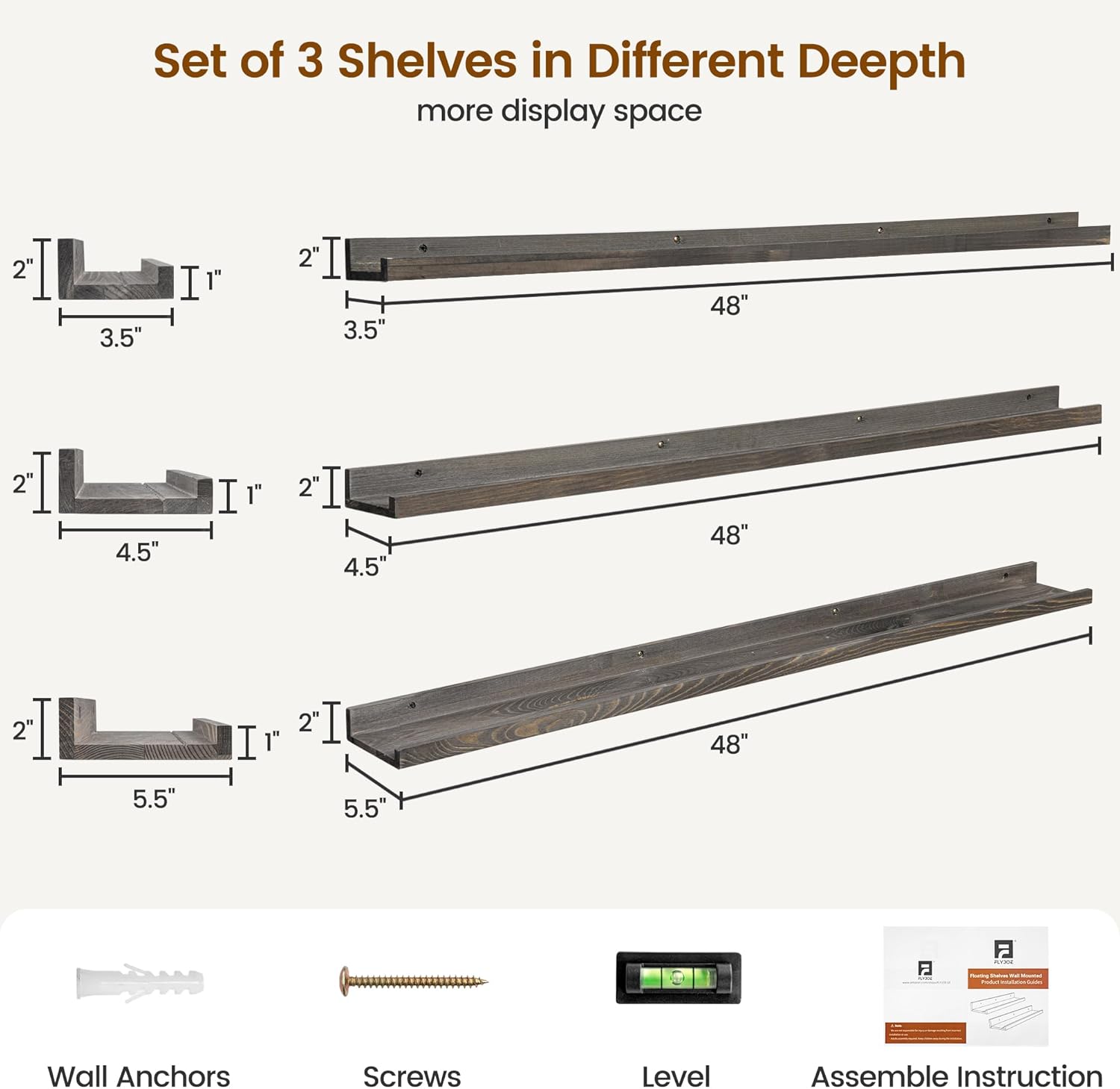 Picture Ledge Wall Shelves 48 Inches Width Set of 3, Solid Pine Wood Rustic Floating Ledge for Kids' Room Bedroom Kitchen Bathroom, Long Floating Shelves for Wall Decor, Grey