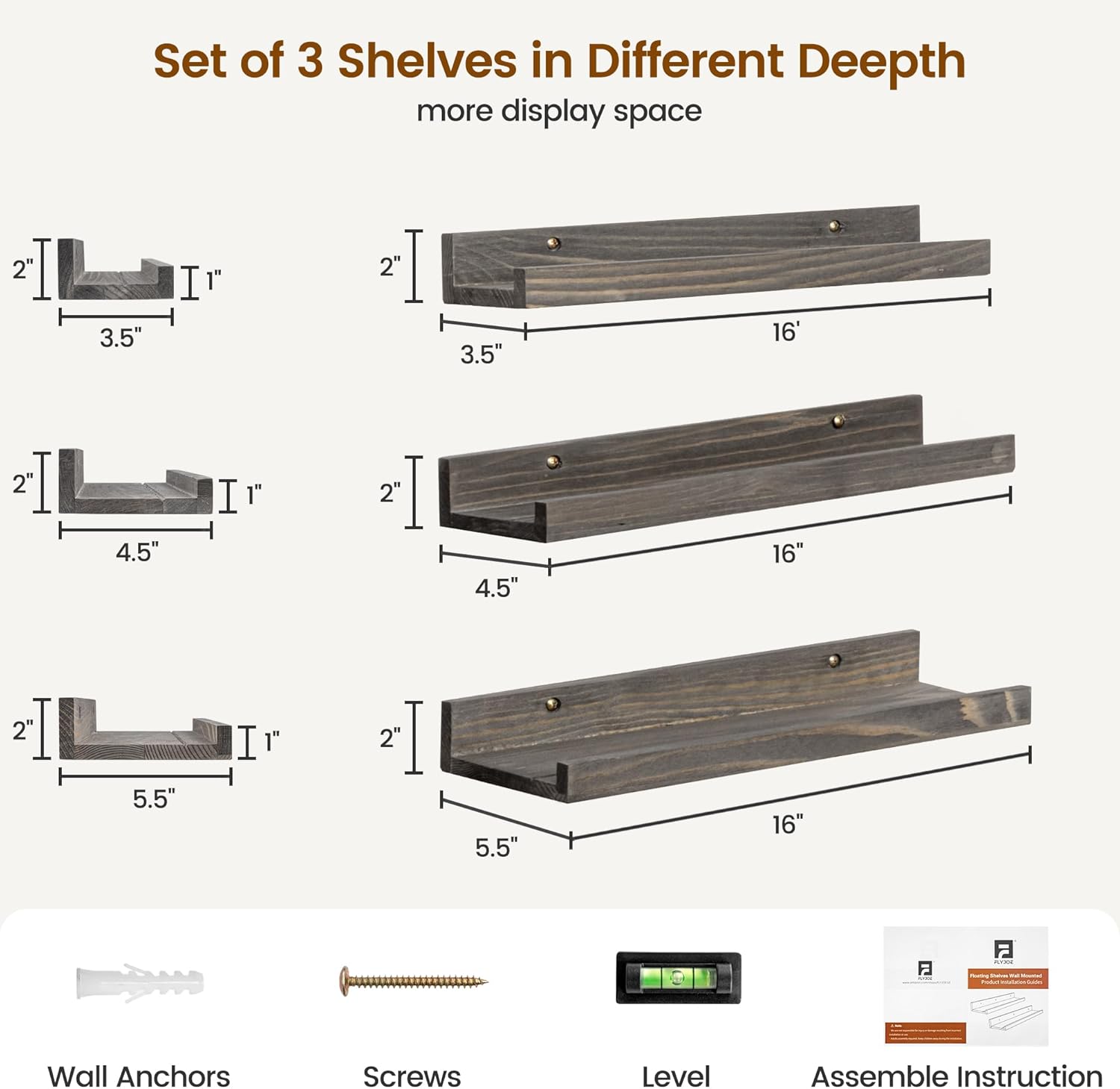 Picture Ledge Wall Shelves - Set of 3, 16 Inch Width, Solid Pine Wood Rustic Floating Ledge Shelves for Kids' Room, Bedroom, Kitchen, Bathroom, Living Room, Nursery Display Decor, Grey