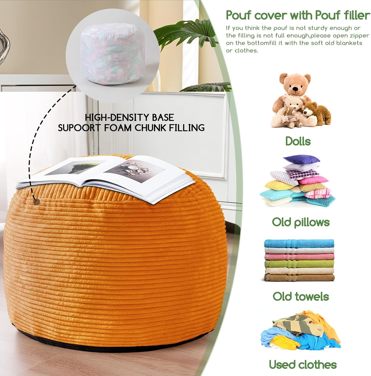 HIGOGOGO Round Stuffed Pouf Ottoman, Corduroy Poufs with Foam Chunk Filling, Furry and Fluffy Pouf Foot Stool Storage Ottoman, 20 X 15 Floor Poufs Foot Rest for Living Room, Orange