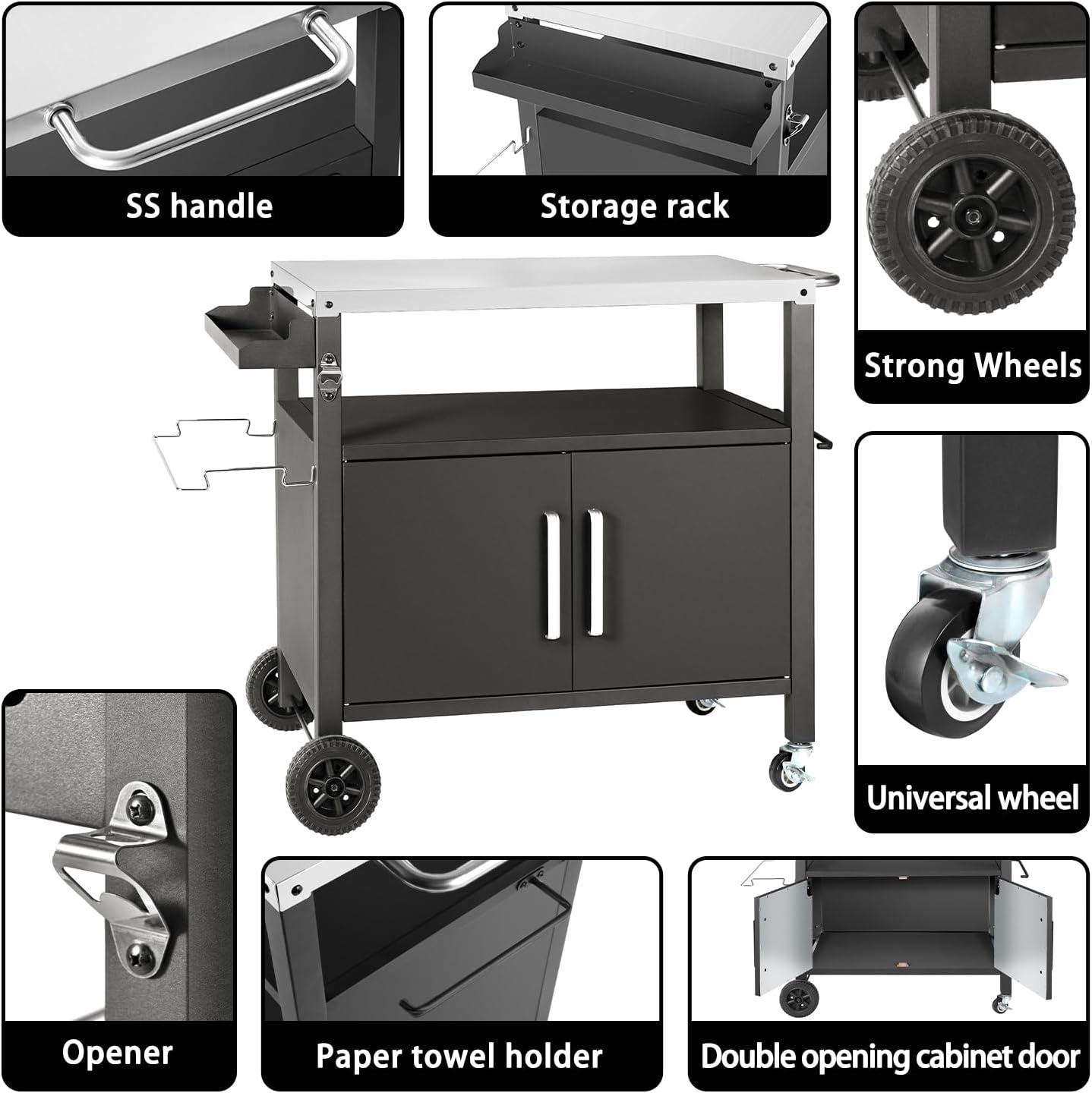 - 【All in one Prep Table】The outdoor BBQ grill table comes with 1pc removable garbage bag holder, 1pc paper towel holder,1pc beer opener, 1pc big side spice rack and 1side handle for keeping towel or move it anywhere and one big storage cabinet.