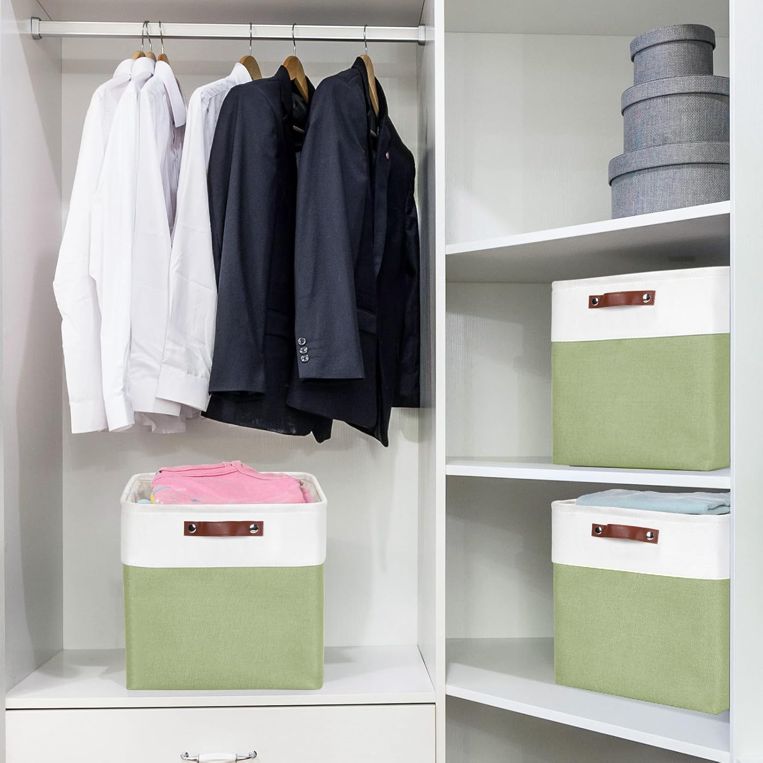 13x13 Cube Storage Bins, Collapsible Fabric Storage Box, 4 Pack Closet Baskets with Handles for Organizing, Shelf, Toys, Clothes, Home, Office, Nursery (Green&White)