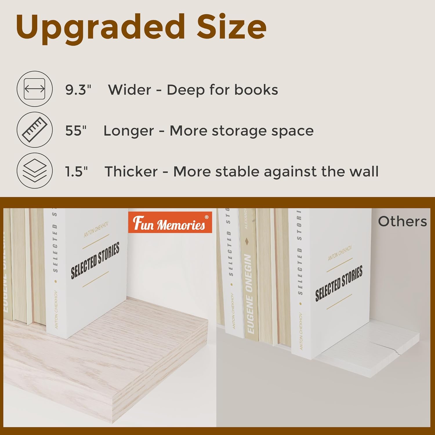 - 【9 INCH DEEP FLOATING SHELF】This extra deeper and thicker wall shelves are 9.3 inches in depth and 1.5 inches in thickness instead of the regular narrow floating shelves, you can put photos, pictures, DVD players, videos, books, toys, and some other knickknack on this beautiful display wooden shelf.