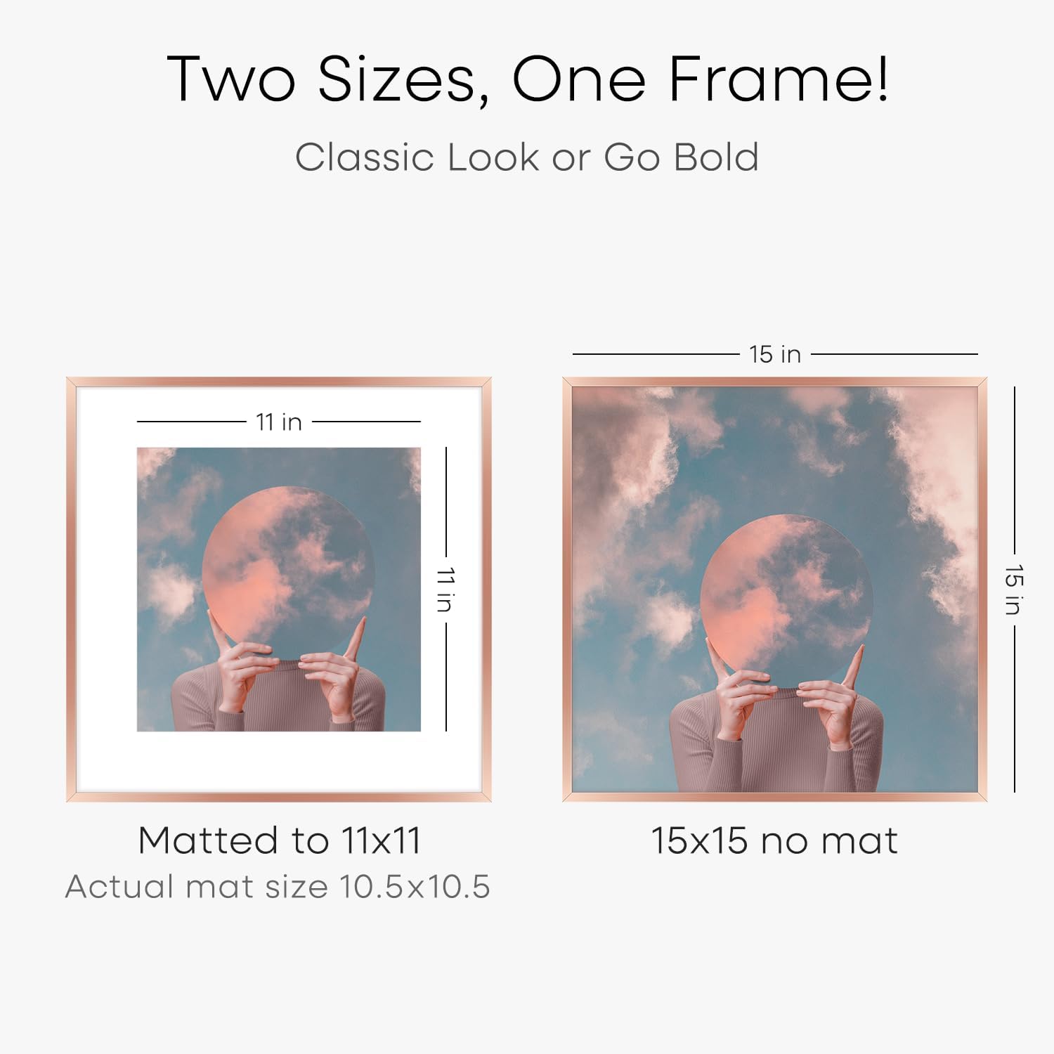 Homeforia 15x15 Picture Frame Rose Gold, High End Metal 15 x 15 Square Poster Frame with Mat 11 x 11 Photo, 15x15 Frame Matted to 11x11 Print, 15by15 Hanging Frames, Tempered Glass, Wall Kit, Set of 1