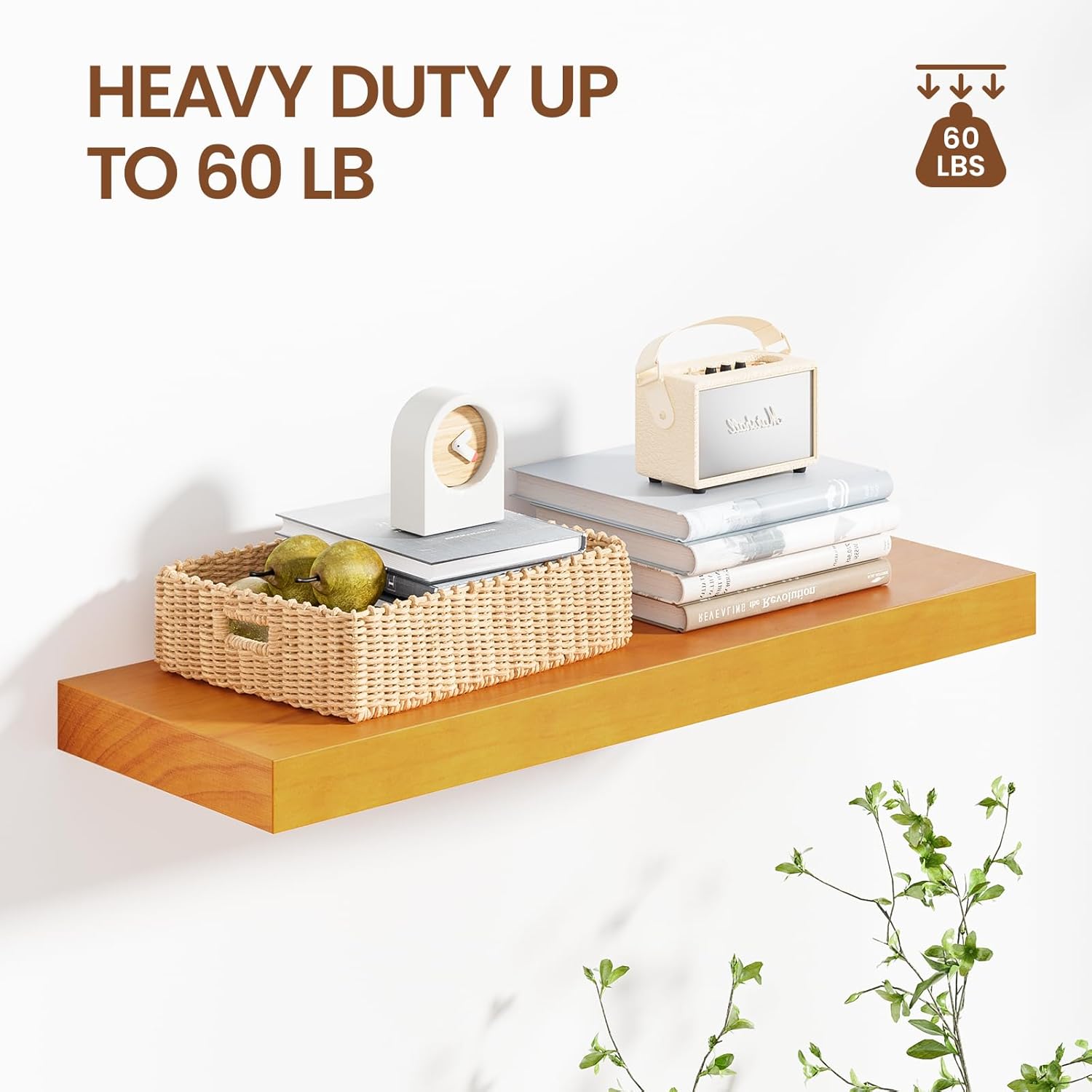 Honey Oak Brown Floating Wall Shelves 24 Inches Long x 8”x 1.4” Wooden Shelf Floating Rustic Farmhouse Decor, Heavy Duty Shelf Hold 60 lbs, Wall Shelves for Bathroom Living Room Kitchen Bedroom Office