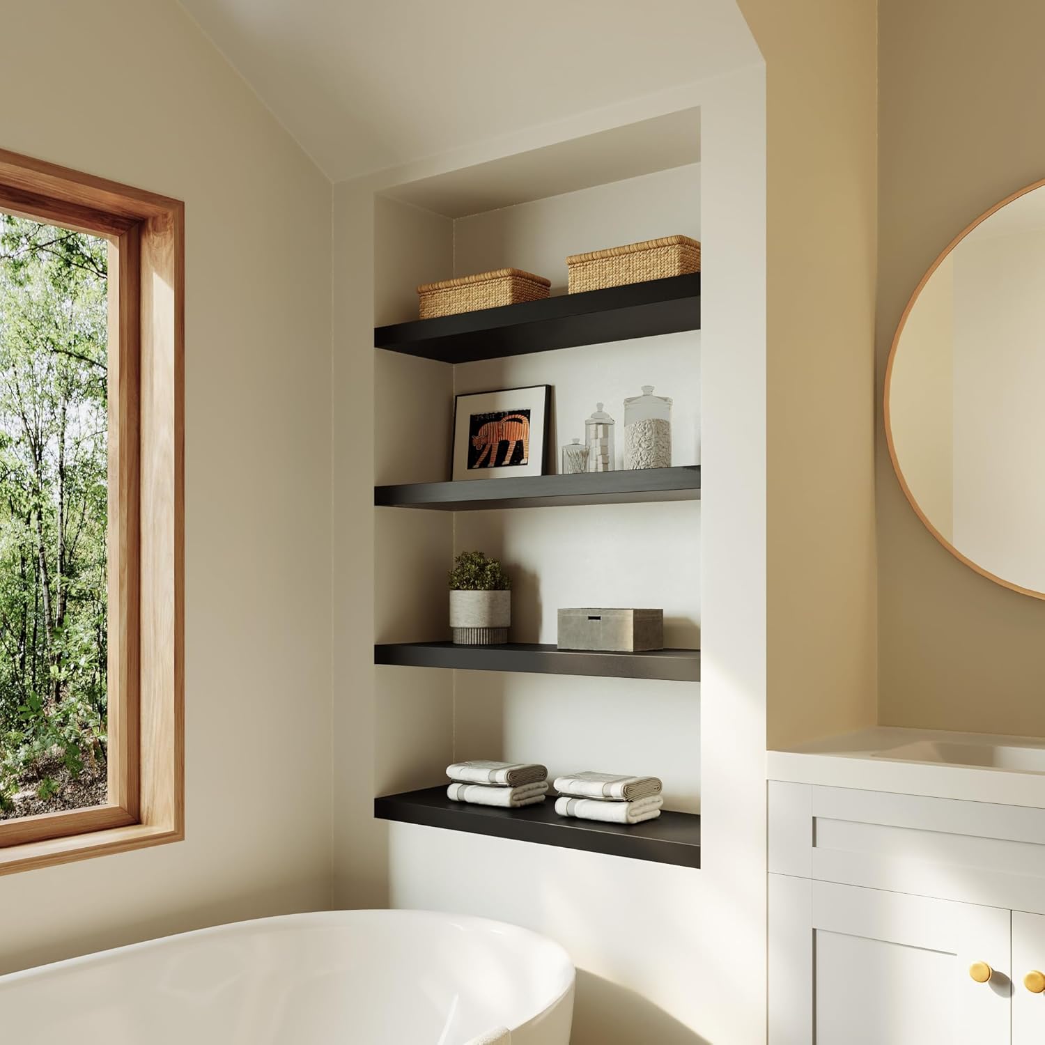 These wall shelves are both functional and stylish, giving my living room a fresh look.