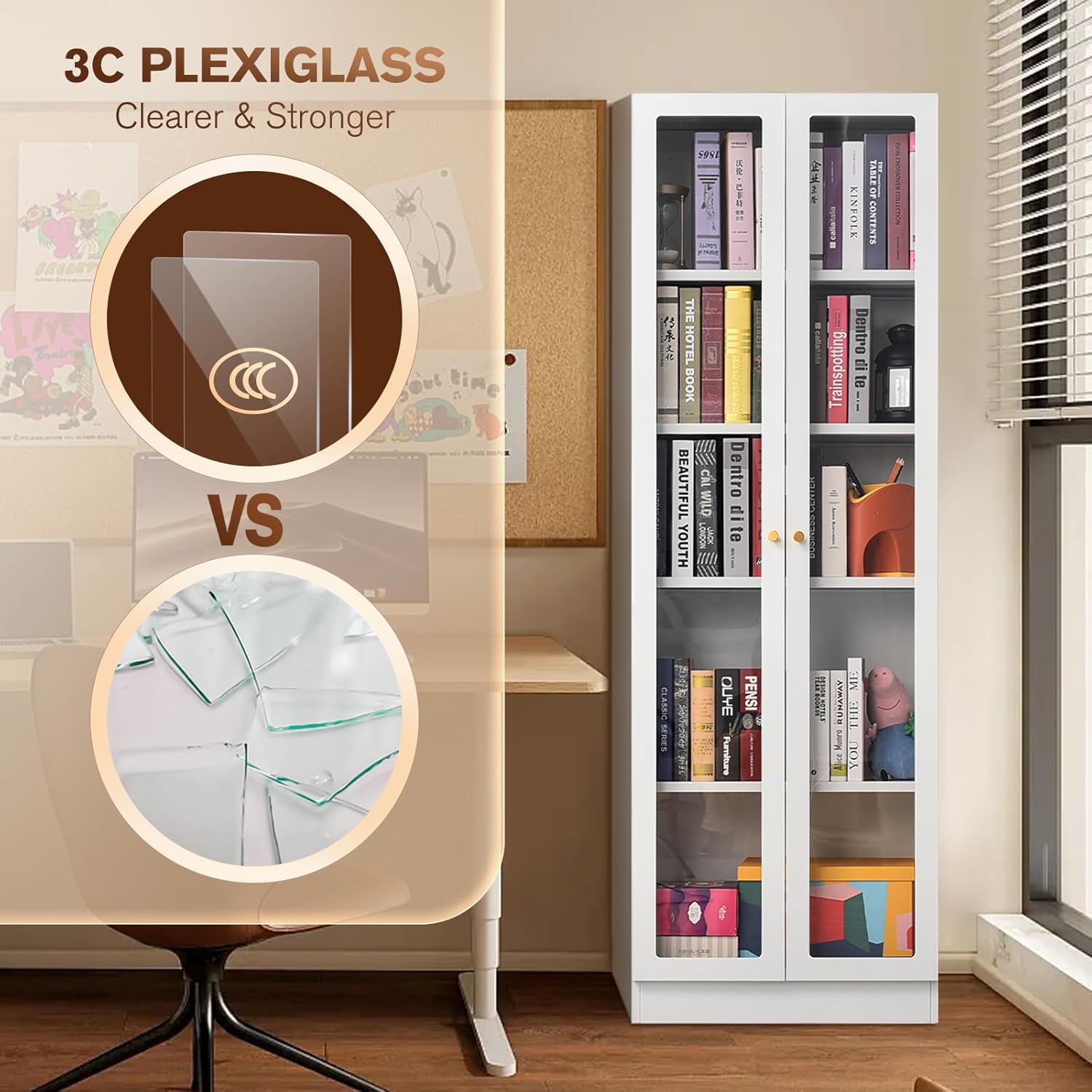 5 Tier Metal Curio Cabinets, Modern Bookshelf Cabinet with 4 Adjustable Shelves, Cabinet Display Case for Home Office, Living Room, Pantry (White-23.54W)