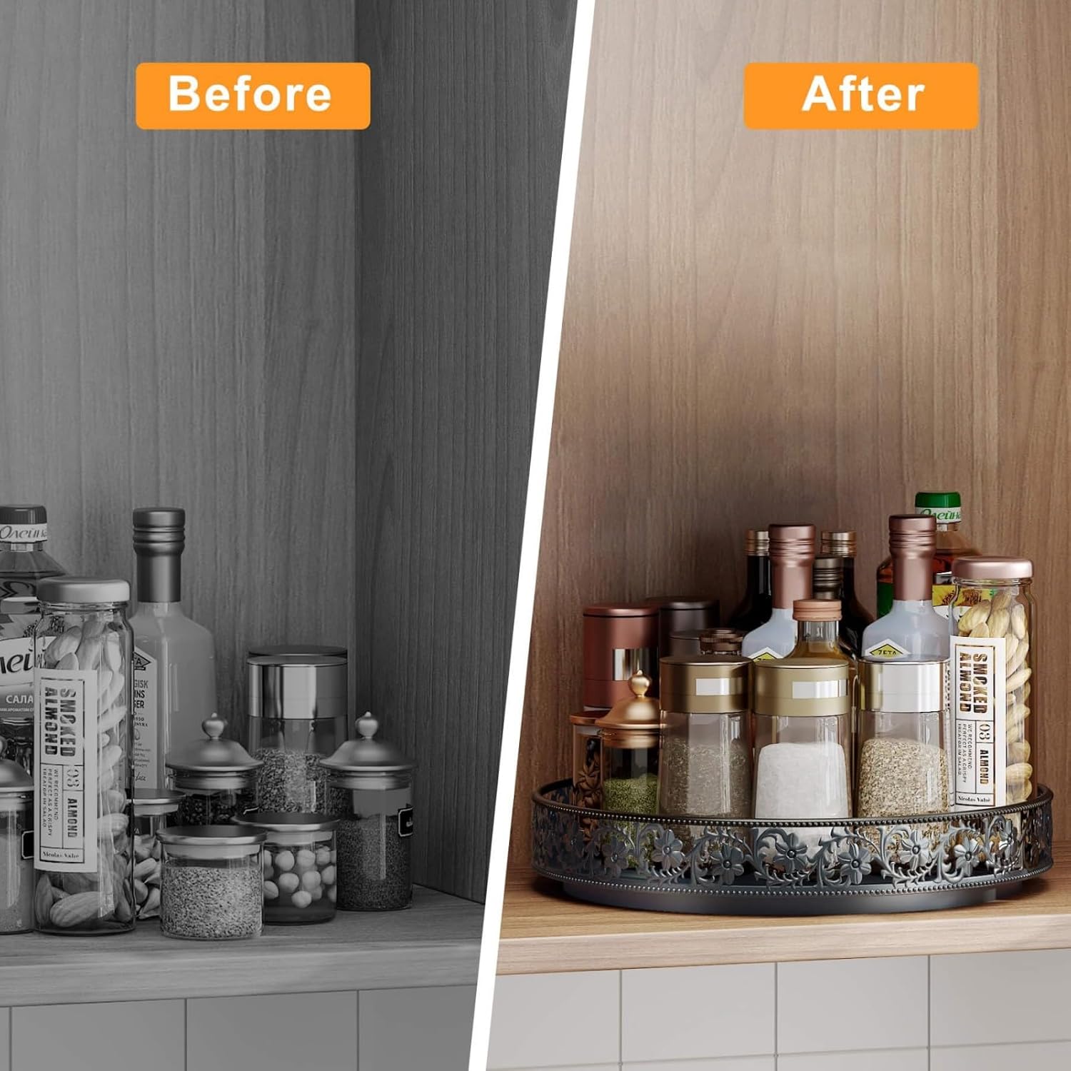 - Durable Material and Easy Cleaning: The heavy duty lazy susan organizer is made of high quality rustproof and waterproof metal. It is stronger and more durable than plastic spinning organizer. Wear-resistant, abrasion-resistant coating ensures long-lasting use and easy cleaning.