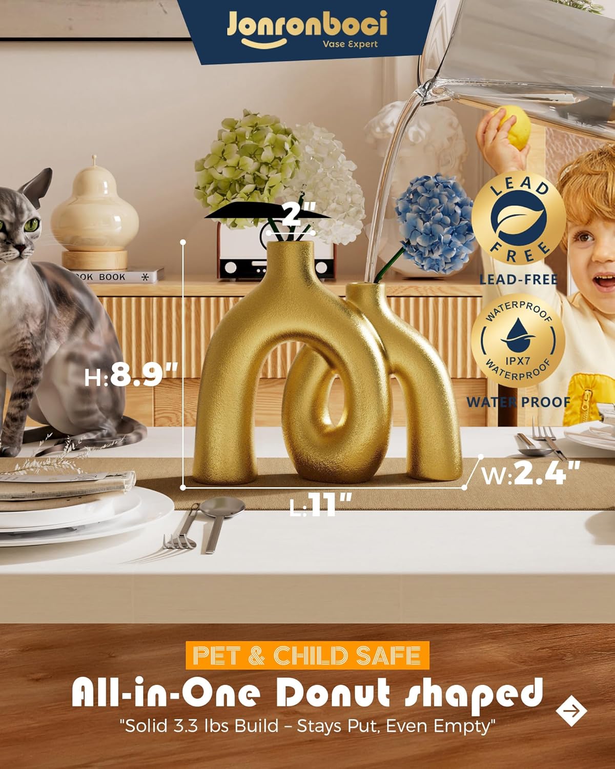 Hug Donut Decorative Vase Set - Golden Modern Classic Transitional Style Vases Home Decor, Matte Ceramic Decorations for Living Room Shelf, Bookshelf Mantle Entryway Table or Console Décor (Gold)