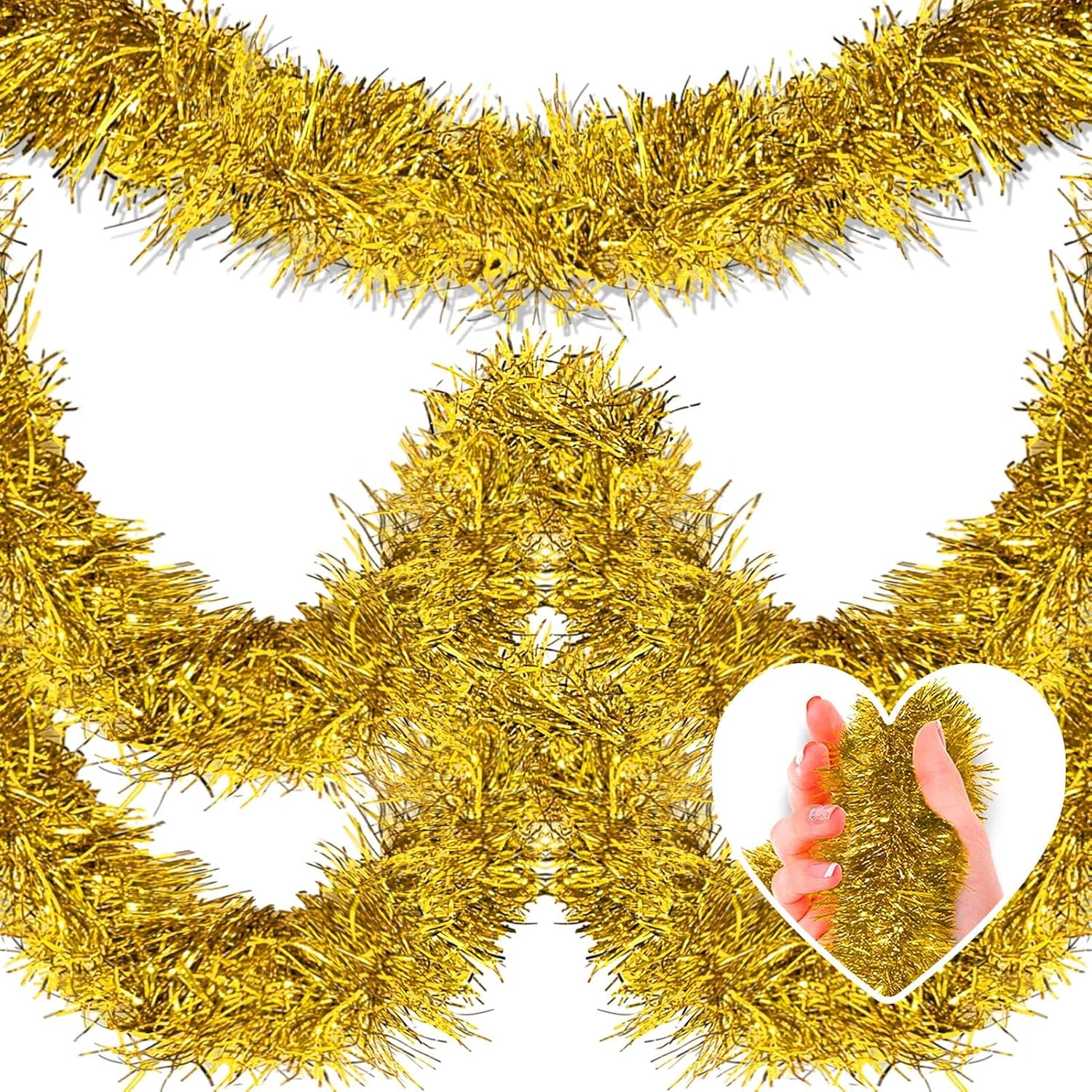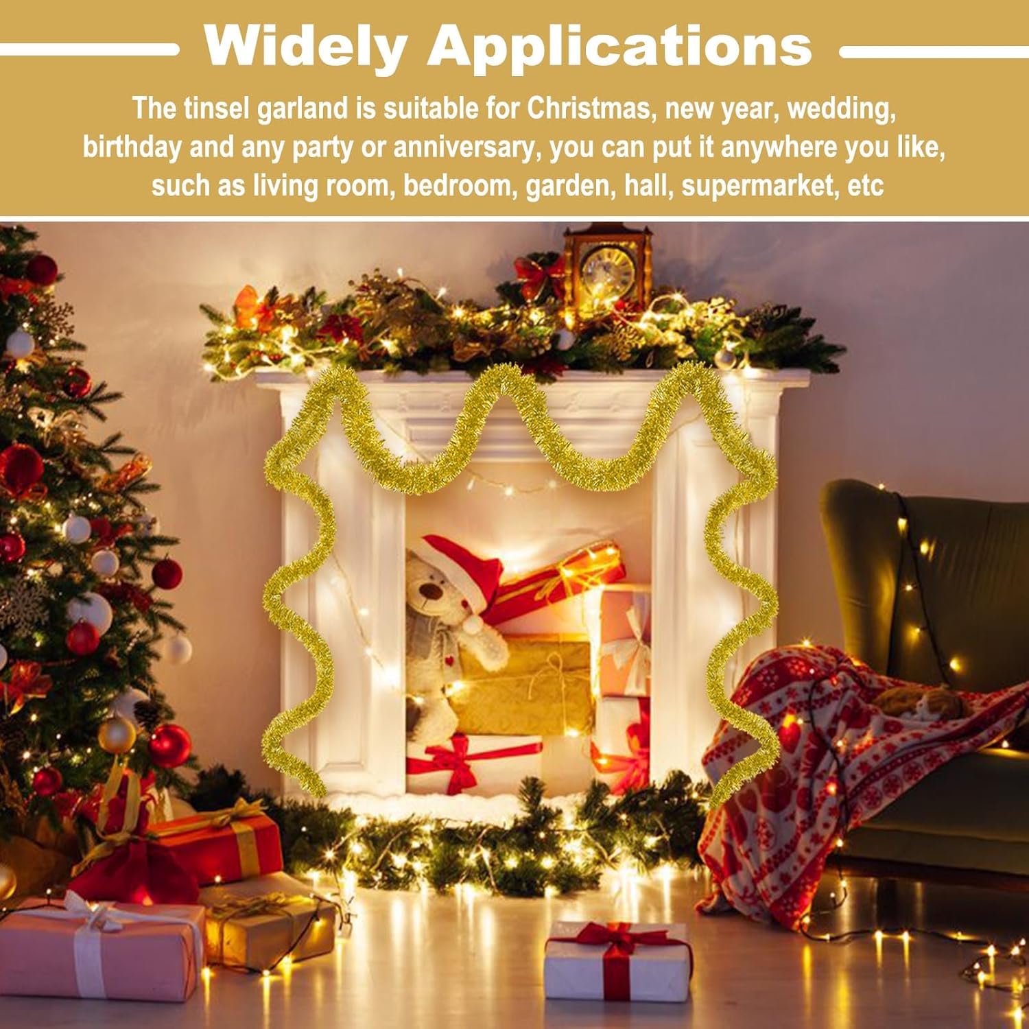 - Wide Application: Suitable for all kinds of special days, such as christmas, new year, valentine's day, halloween, festivals, wedding, engagement, bridal baby shower, graduation celebrations. The tinsel garland are perfect decorations for party, home decorations, parade float, garden, christmas tree, christmas wreath, wall, ceiling, door, hedge, stair rail, doorway, window, pole, table and so on