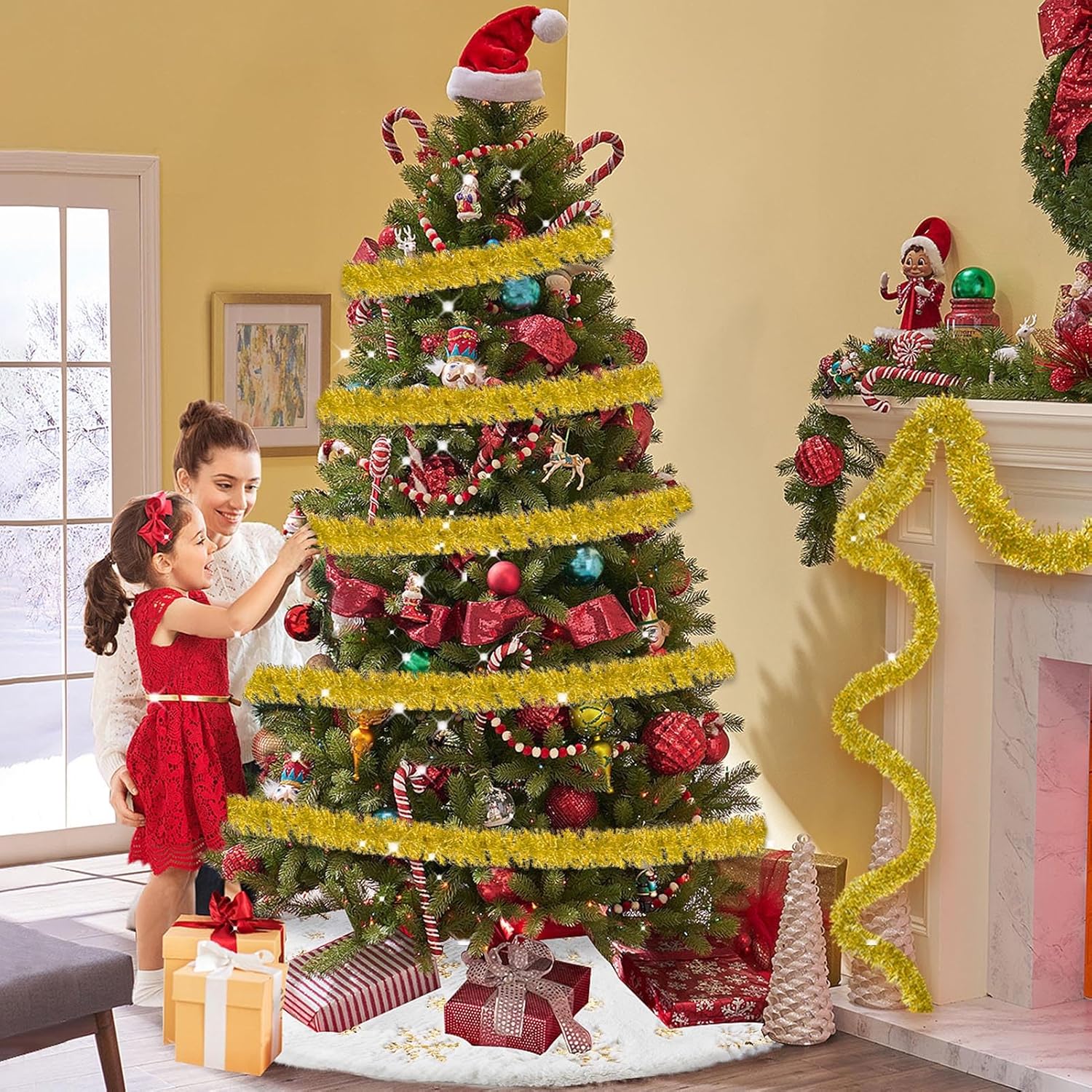 - Easy to Hang: Christmas tinsel garland include a soft, bendable wire inside, and easy to shape as different looks. You can also trim it into different sizes, twist them into various shapes as you like, or with the tape stick it on the wall, window, table, door, rail or any place you like, show the christmas glamour to make your party decoration for the home fun