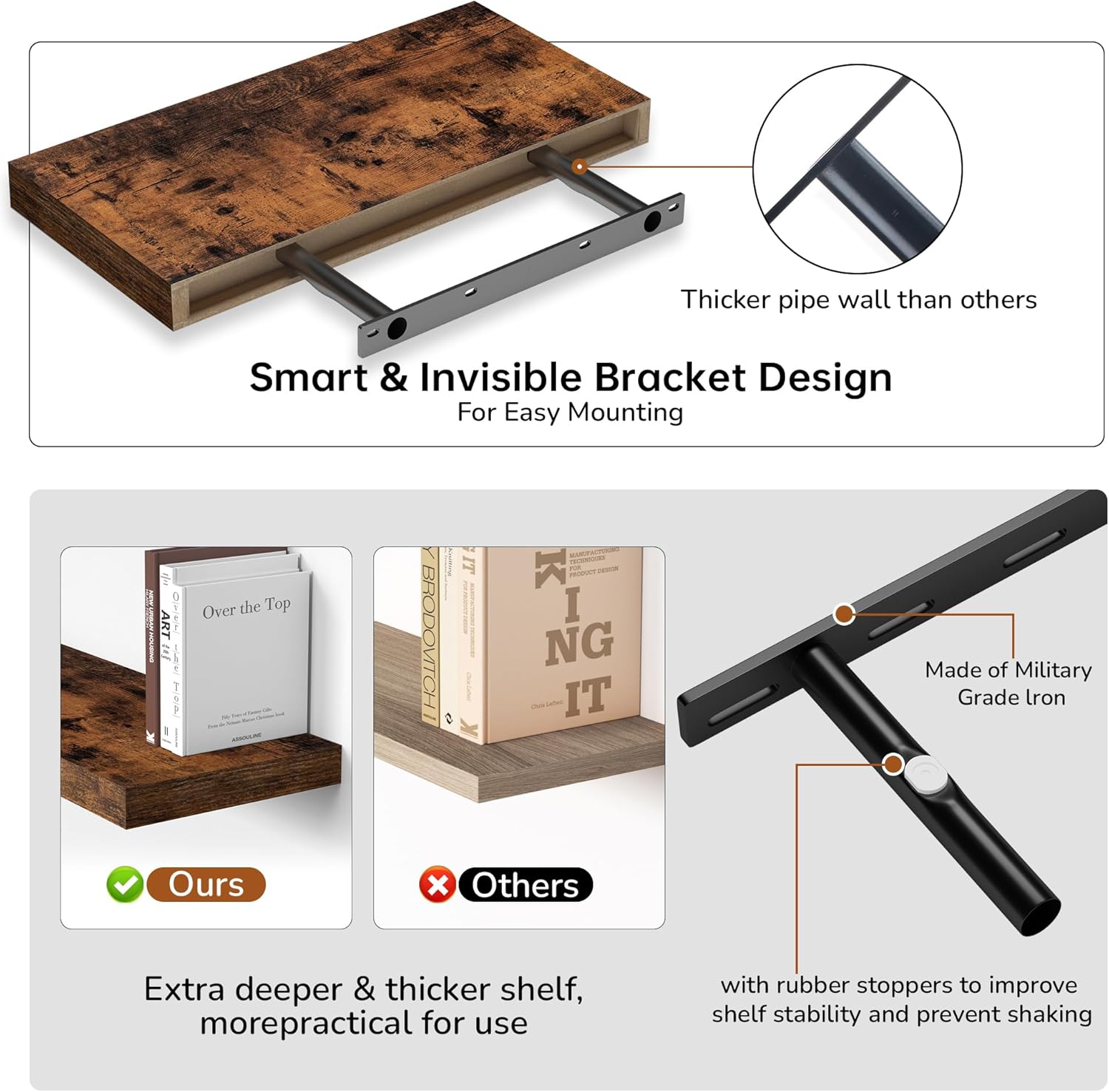 - Rustic & Modern Wooden Floating Shelves: Crafted from durable engineered wood with a realistic wood grain finish, our floating shelves offer the perfect blend of rustic charm and modern minimalism. The matte surface enhances its sleek, contemporary look, making it ideal for any room in your home. Whether you want to display your collection or organize essentials, these wall shelves seamlessly integrate with any décor and can be mounted on any wall to elevate your living space.