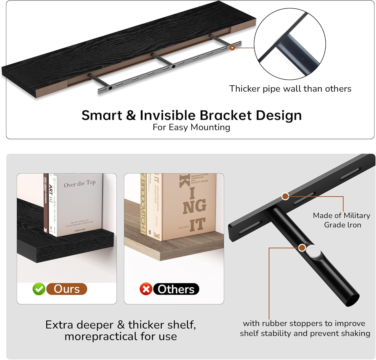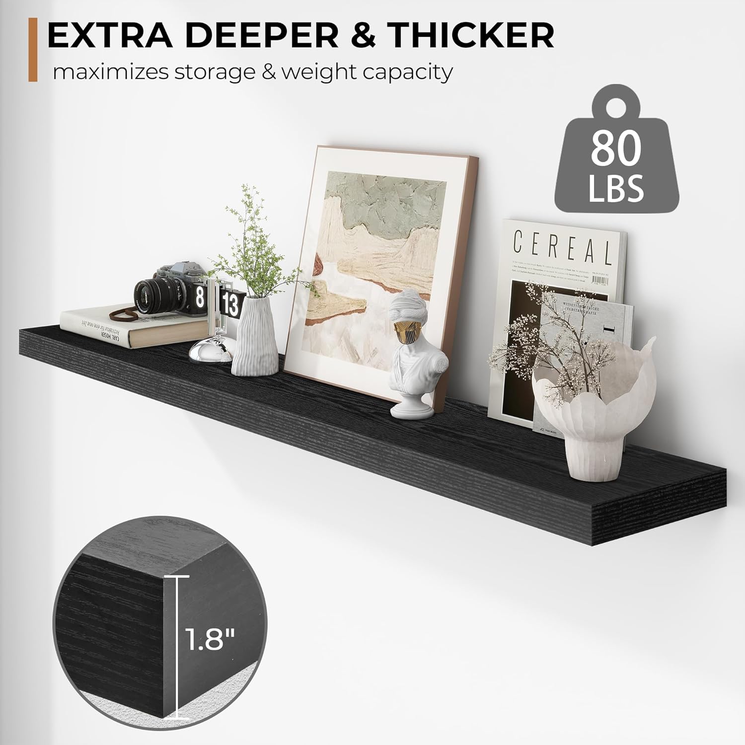 - Extra Deeper & Thicker - Each board measures 55"W x 9.3"D x 1.8"H. Extra deeper and thicker design in order to bring maximizes storage space and weight capacity, even hold up to 80 lb each. This floating shelf taking up zero square feet, reduces clutter and highlights décor in compact spaces.