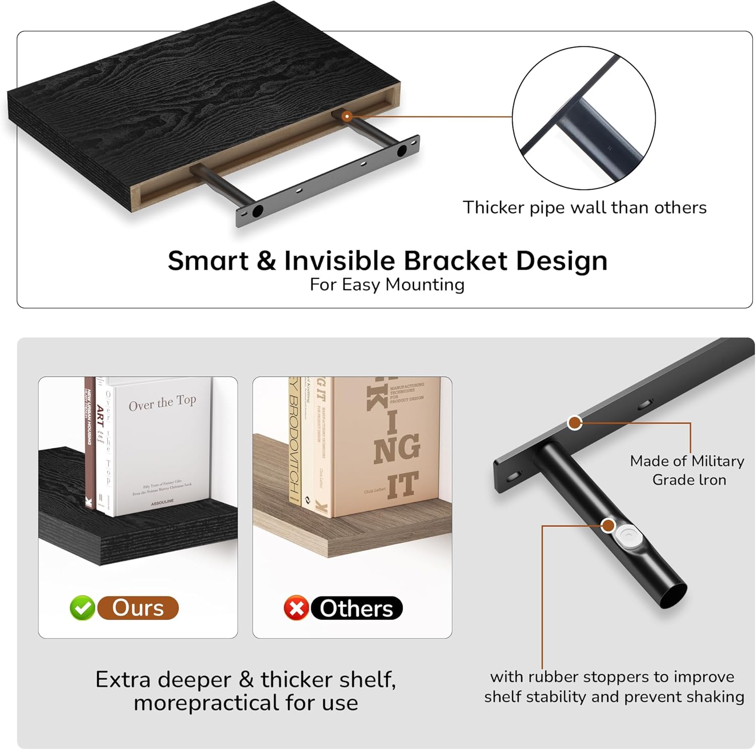 - Extra Deeper & Thicker - Each board measures 16"W x 12"D x 1.5"H. Extra deeper and thicker design in order to bring maximizes storage space and weight capacity, even hold up to 30 lb each. This floating shelf taking up zero square feet, reduces clutter and highlights décor in compact spaces.