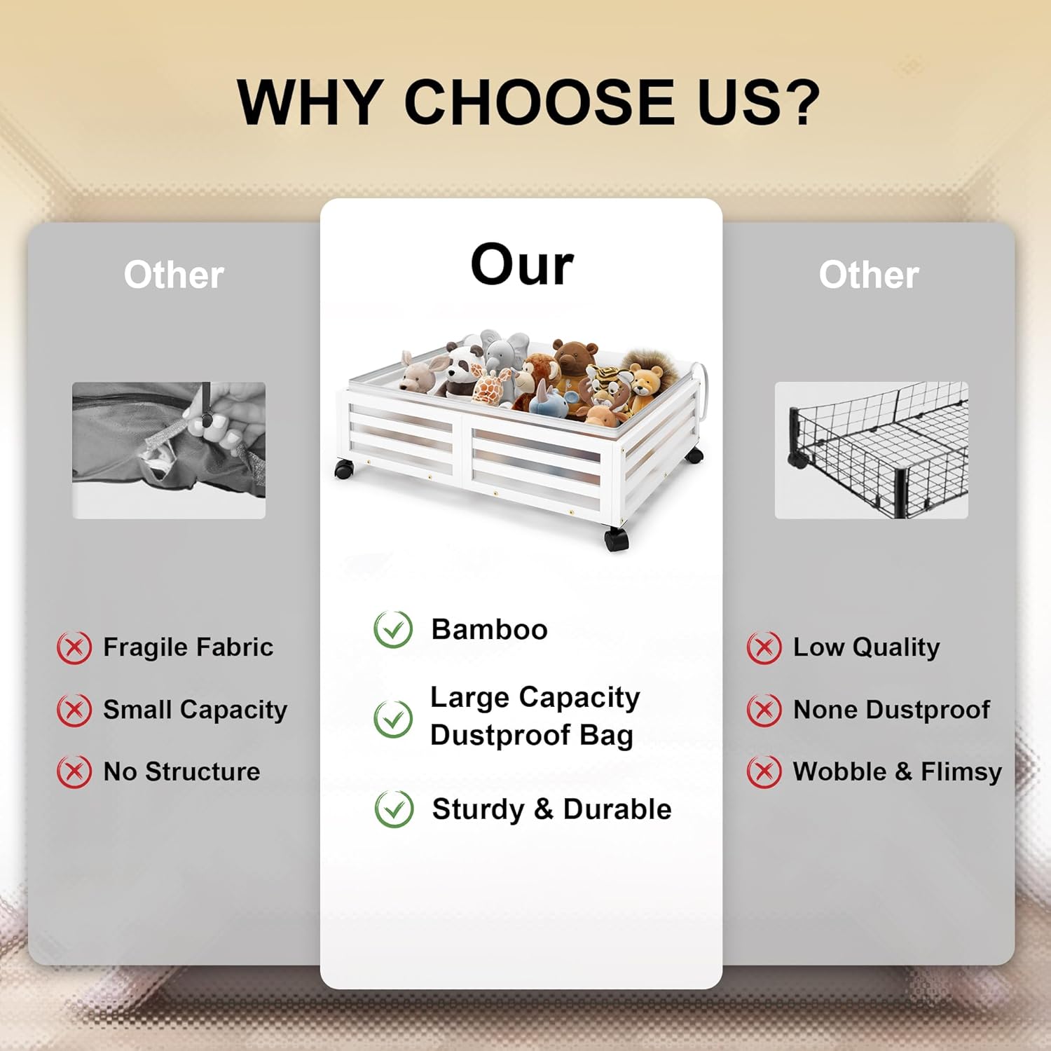 Under Bed Storage Containers With Wheels - 2 Pcs Bamboo Wood Rolling Underbed Shoe Storage Bins With Dust Bags for Clothes Blankets, Duvet Covers Snacks Toys (White)