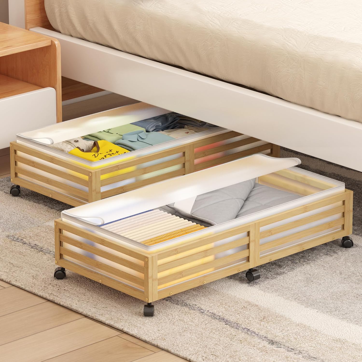 Under Bed Storage Containers With Wheels - 2 Pcs Large Bamboo Wood Rolling Underbed Shoe Storage Bins With Dust Bags for Clothes Blankets, Duvet Covers Snacks Toys (Natural)