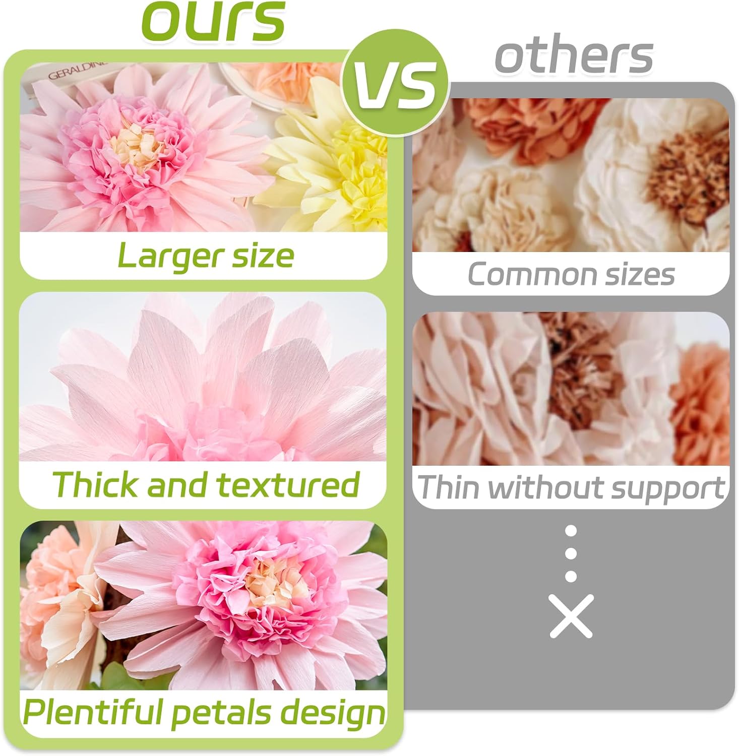 - Variety & Quality Materials - Includes 6 pieces of 12-inch flowers made of thick, textured crepe paper for added support and elegance, along with 6 delicate 6-inch flowers crafted from soft tissue paper for a balanced and versatile decor set.