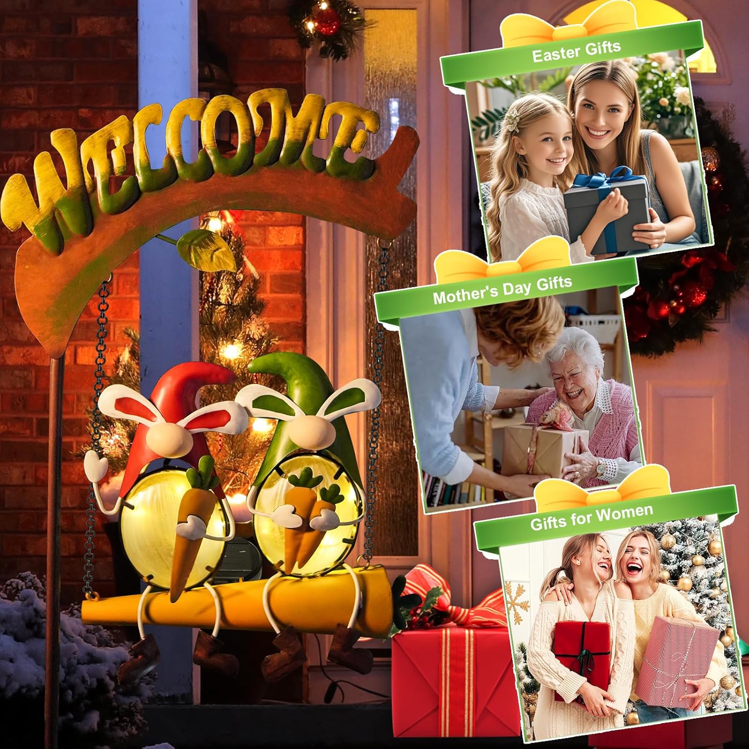 HONGLAND Solar Lights Outdoor Decor, Gnomes Swing Garden Decor, Funny Gardening Gifts for Women Mom, Gnome Outdoor Decorations with Welcome Sign for Front Porch Patio