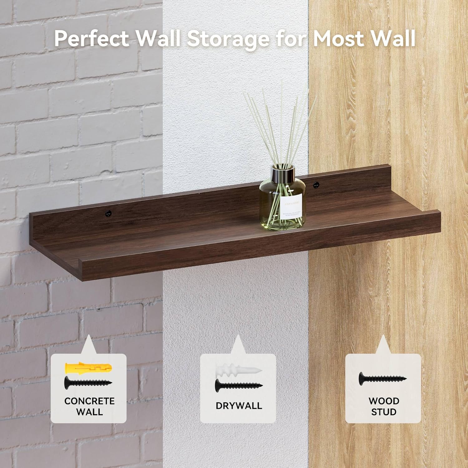 RICHER HOUSE 5 Set Floating Shelves for Wall Decor, Wall Mounted Book Shelf, Nursery Shelves Picture Ledge Shelf with Lip for Wall Storage, Bedroom, Living Room, Bathroom - Walnut